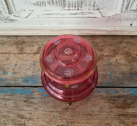 1800 tals smykkeskrin i hindbær/lyserødt glas med emaljebemaling