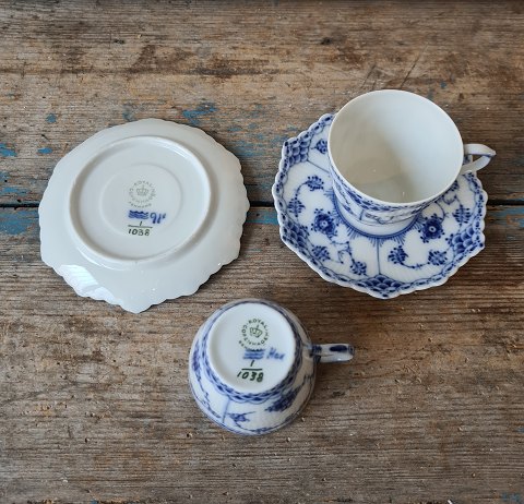 Royal Copenhagen Musselmalet helblonde mokkakop No. 1038, 1. sortering Mål på koppen: Højde 5,2 cm. Diameter 6 cm. Mål på underkoppen: 11,5 cm Lager: