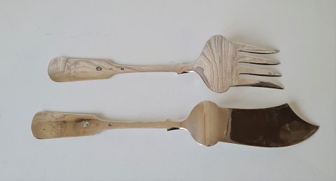 Musling fiske serverings bestik i sølv fra 1913 Stemplet de tre tårne 1913 - G.F Længde 25,5 - 30 cm. Fremstår med gravering på bagsiden