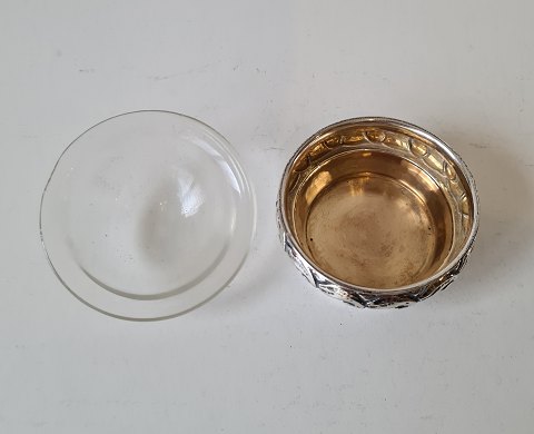 Smukt saltkar i hammerslået sølv med glas indsats Stemplet de tre tårne 1920 Højde 3 cm. Diameter 6 cm.