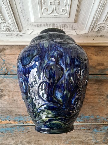 Møller & Bøgely large beautiful vase in glazed ceramic. Beautiful decoration in relief with beautiful glaze in blue and green shades. Beautiful condition. Signed MB Height 27 cm.