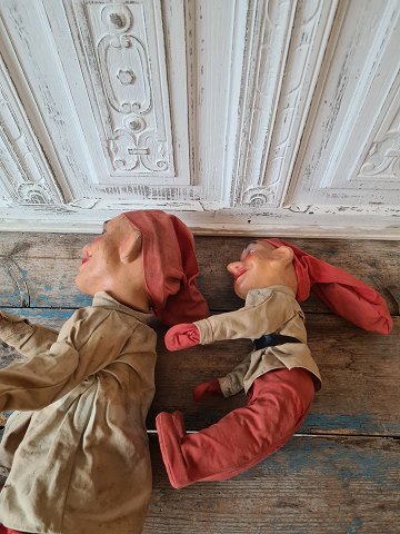 Par gamle fine butiks nisser, deres hoveder er fremstillet i håndmalet keramik, arme og ben kan bøjes. Højde 38 & 64 cm.