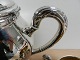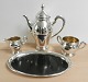 Smukt kaffeservice i hammerslået sølv bestående af kaffekande, sukkerskål, flødekande og bakke med sølv kant og bund af bakelit.