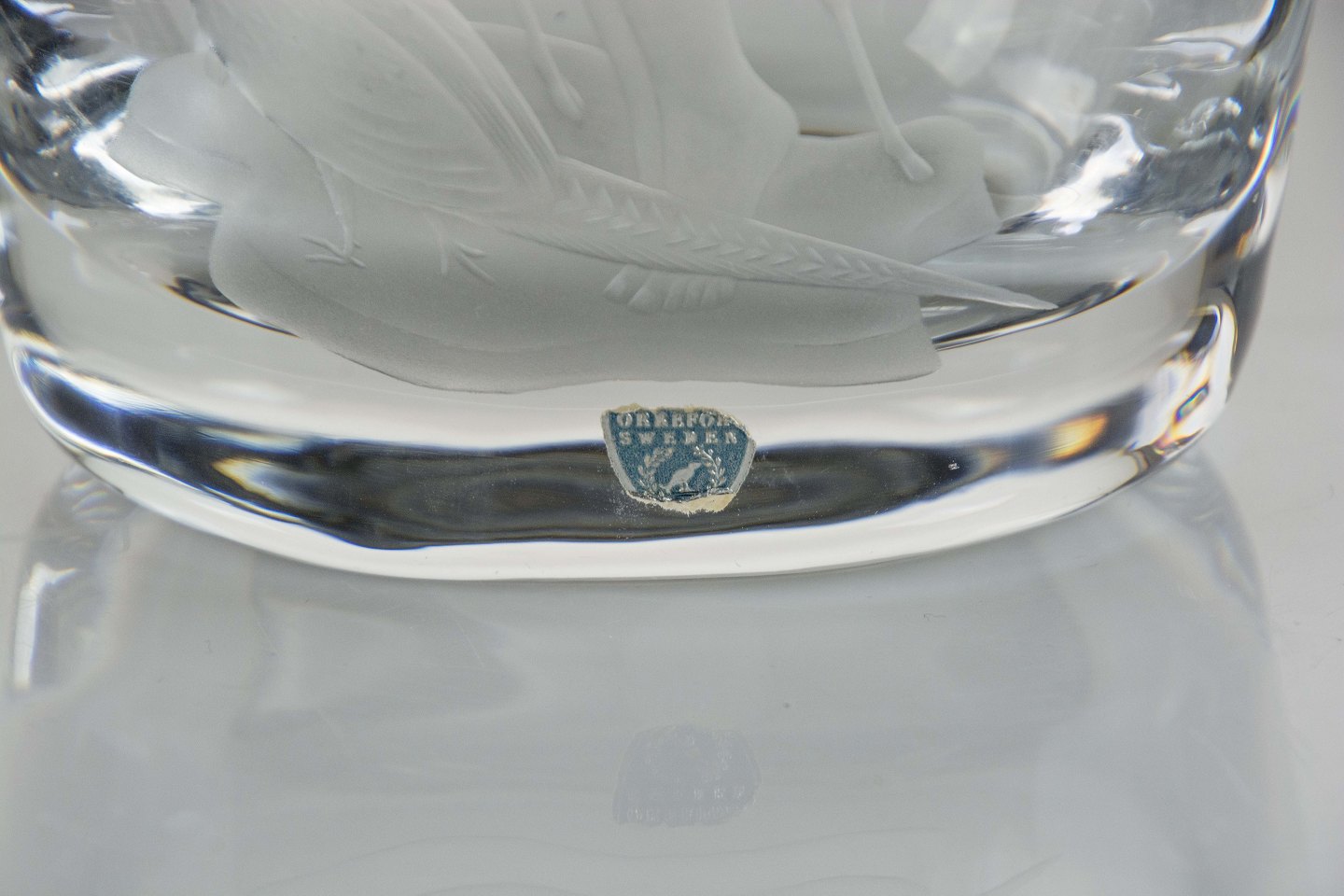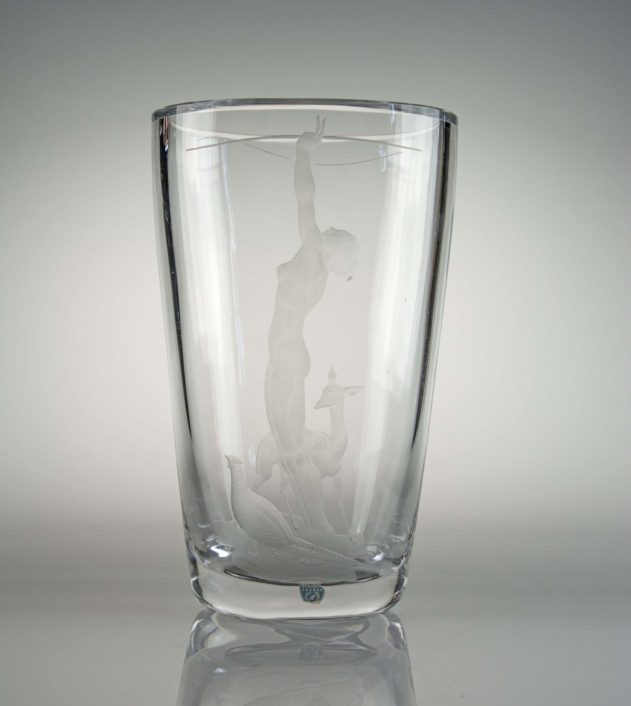 Vase i glas med indgraveret motiv af kvinde med bue, dådyr og fasan nr. 2696