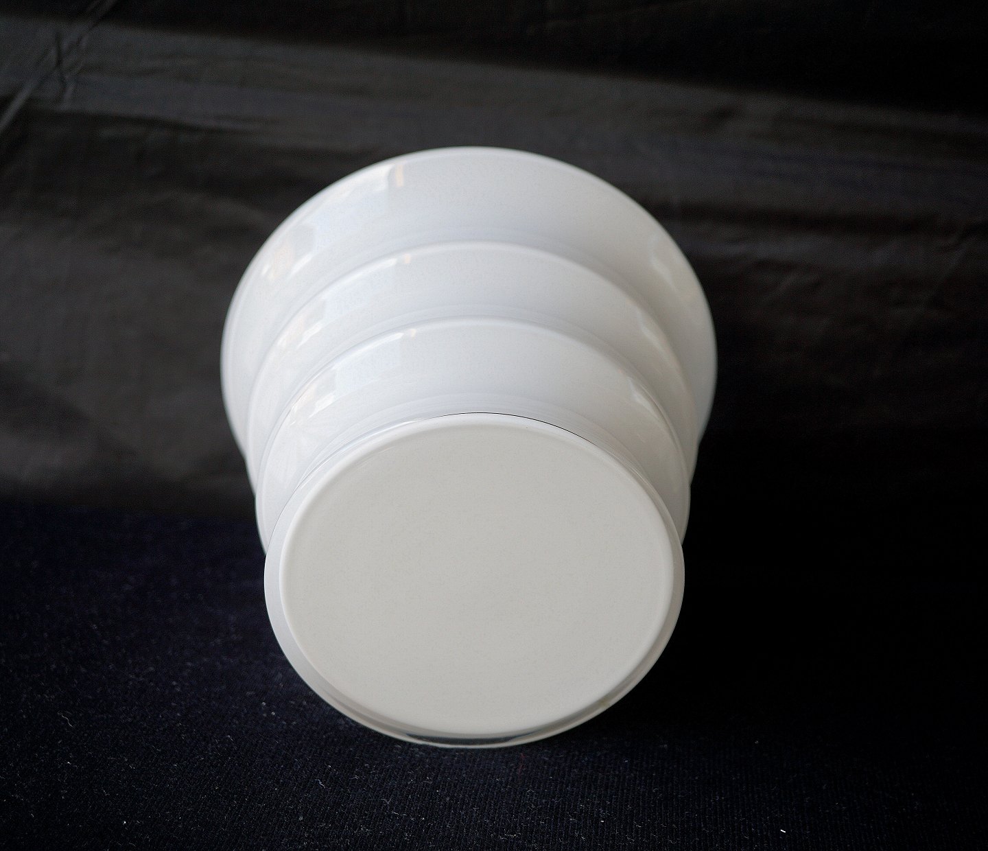 Karen Blixen urtepotteskjuler, opalhvidt glas. Formen er konisk, blæst i form med 2 vulster på midten