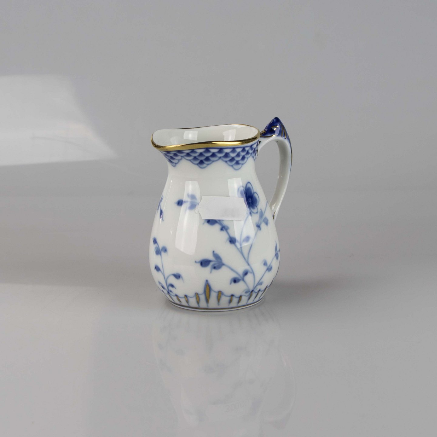 Kande i hvidt porcelæn med guldkant med blå motiver af blomster og sommerfugle.
