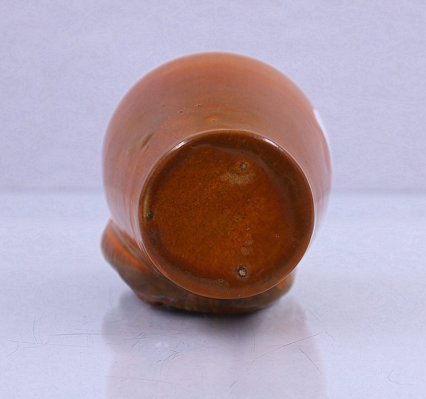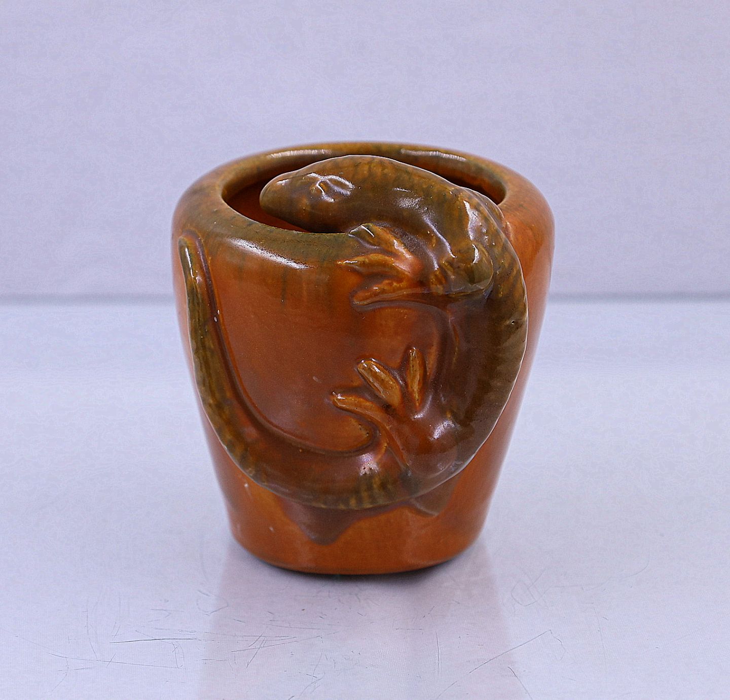 Brunlig vase mede gekko, som dekoration. Vasen er af keramik. Vasens facon er konkav. Vasens oprindelse ukendt, der er ingen skår og afslag på vasen