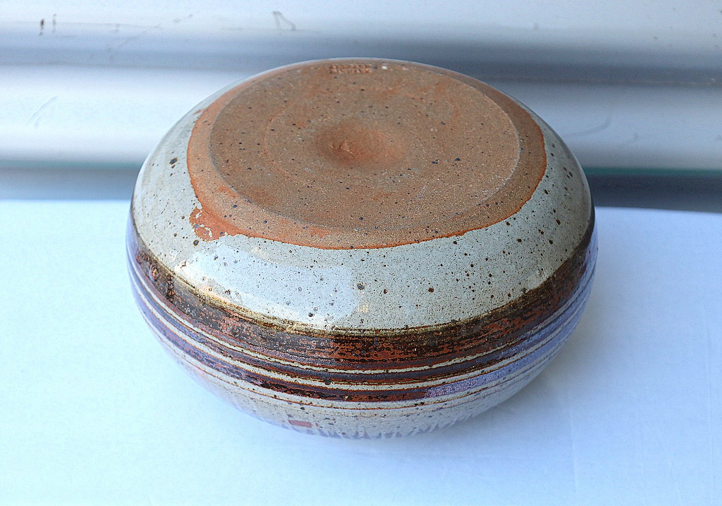 Allpass, Danmark. Helle Allpass keramik. Rund lertøjsskål i brune nuancer, indvendig er der lavet kant til bloklys.