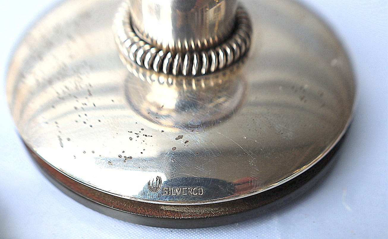 Lysestager stemplet "Silverco". "Silverco" lysestager 3-tårnet sølv, fra 1954. Lysestagerne er pyntet med en spiral. Bunden på stagerne er lavet af plastlignende materiale.