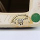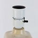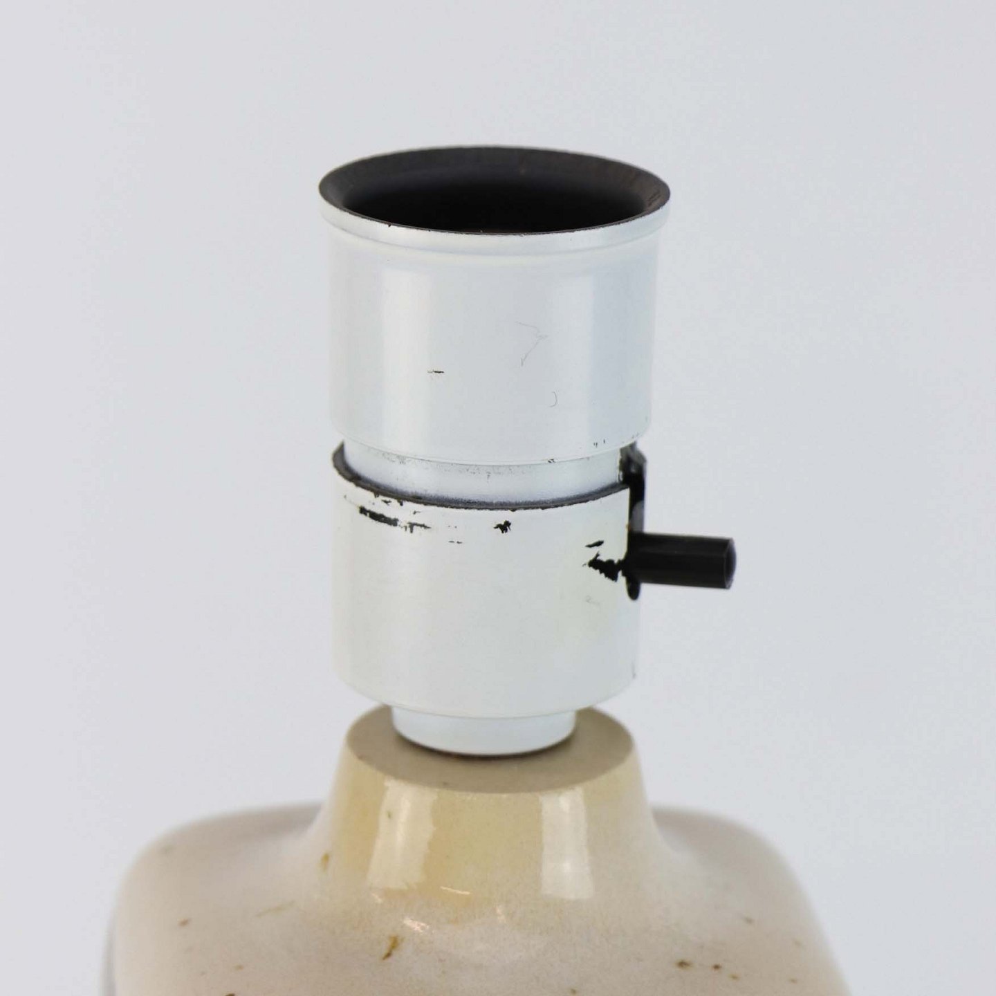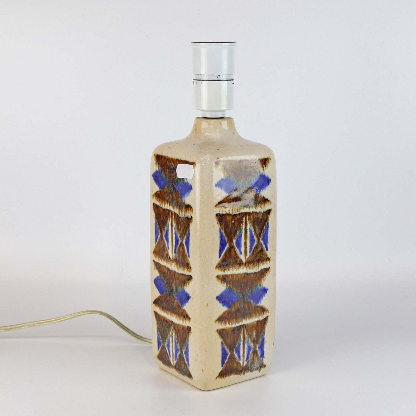 Bordlampe i glaseret keramik, dekoreret med kubisk mønster i blå og brun farver på sandfarvet baggrund