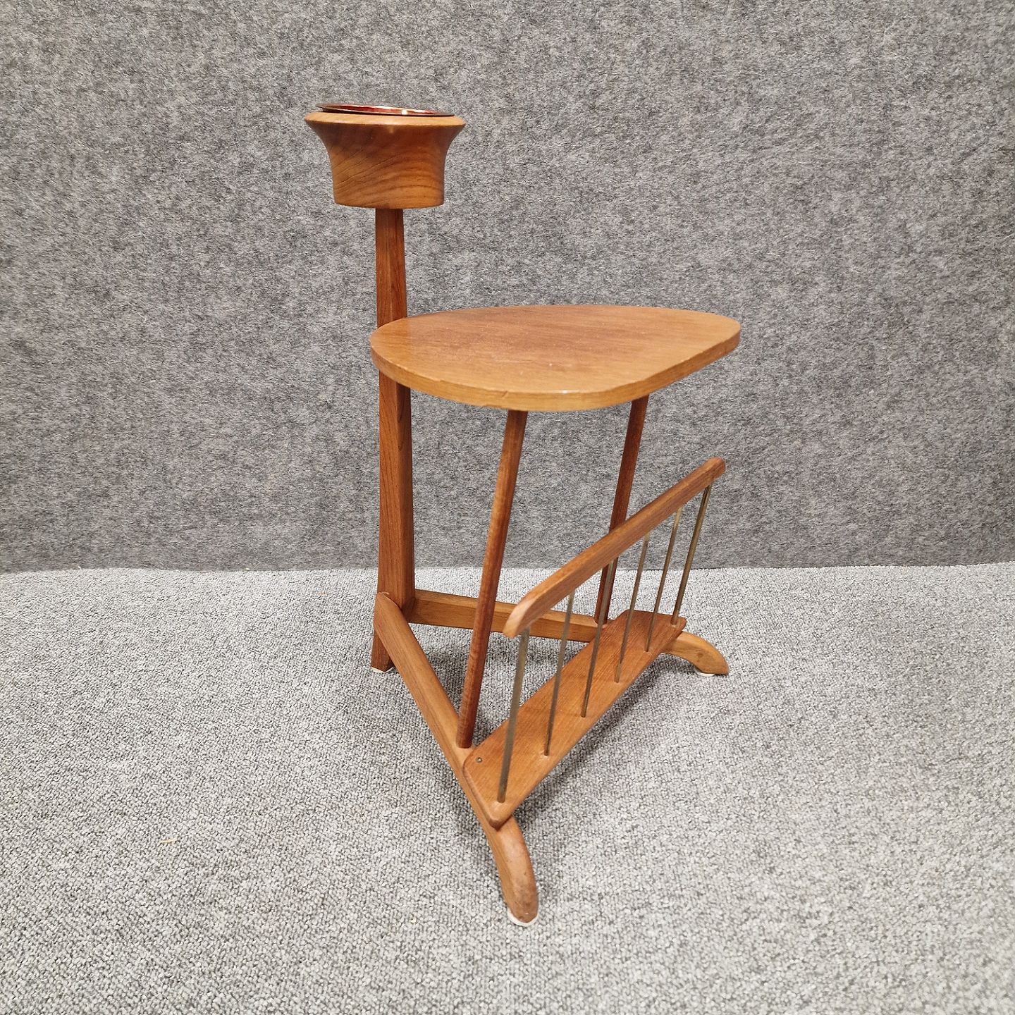 Askebæger, bord og magasinholder i et møbel lavet af ? Askebægeret er aftageligt og lavet af kobber