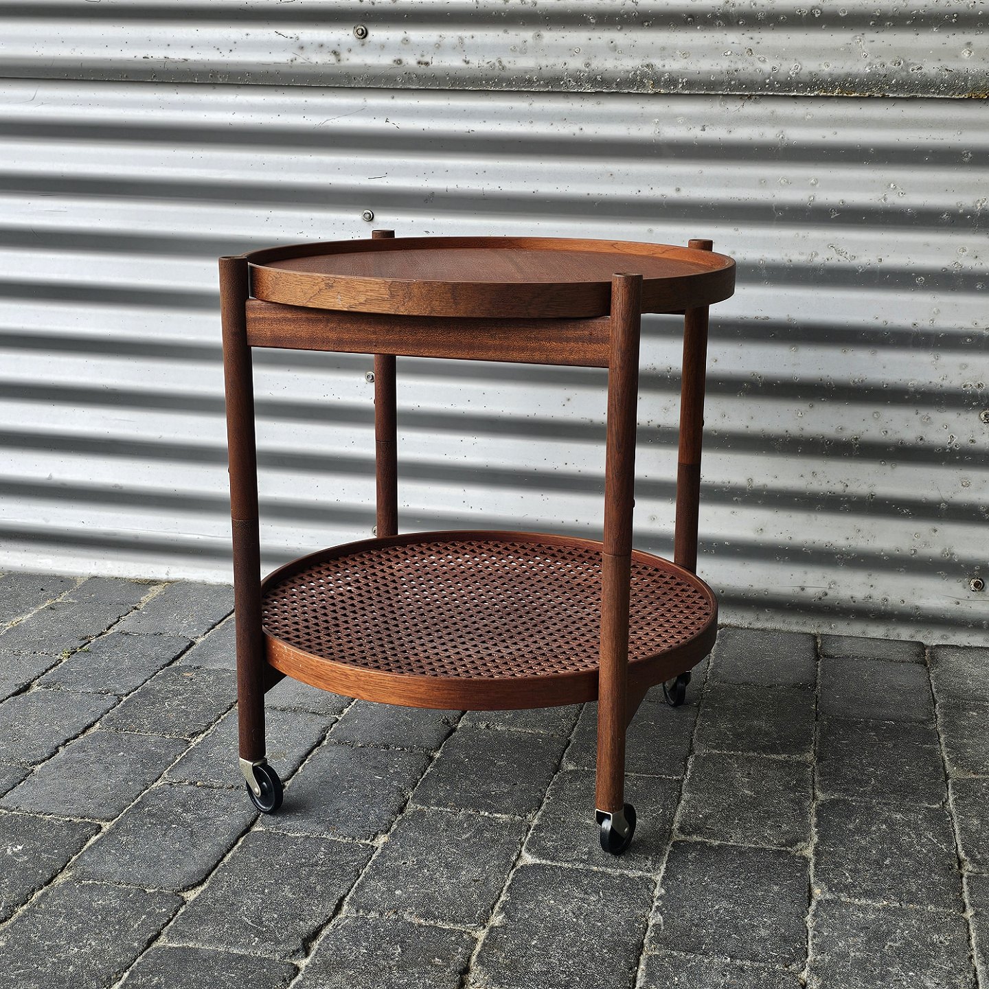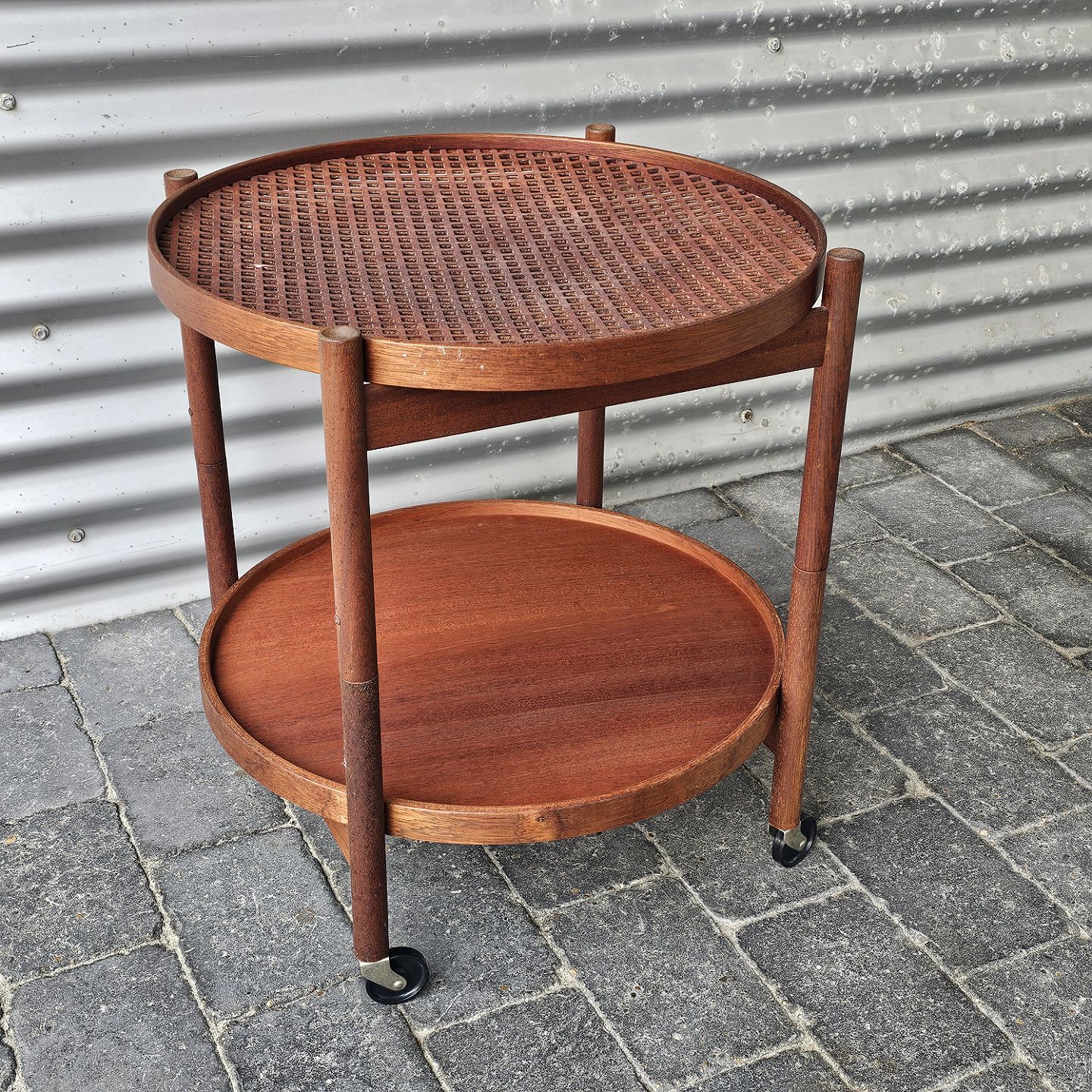 Rundt bakkebord i teak, specielt med hullet plade.