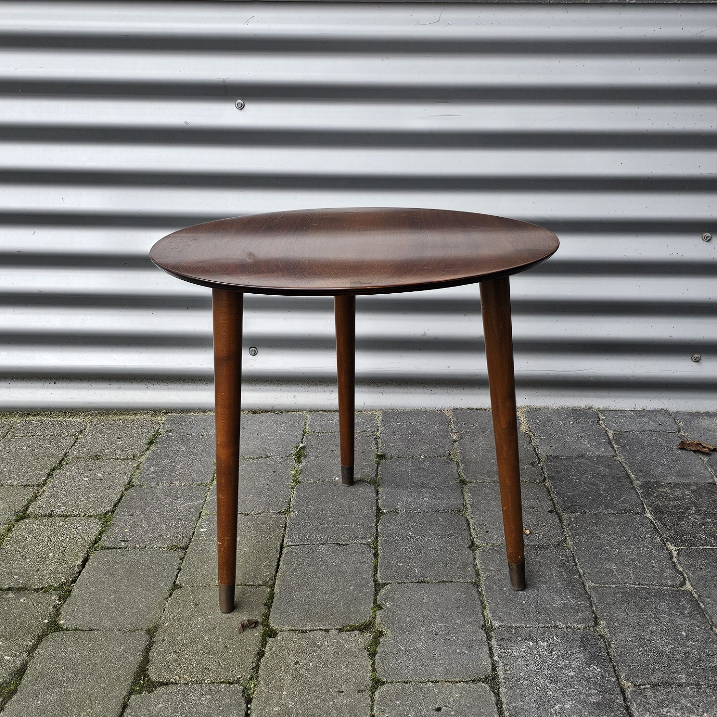 Lille rundt sofabord af palisander, med tre tilspidsede ben.