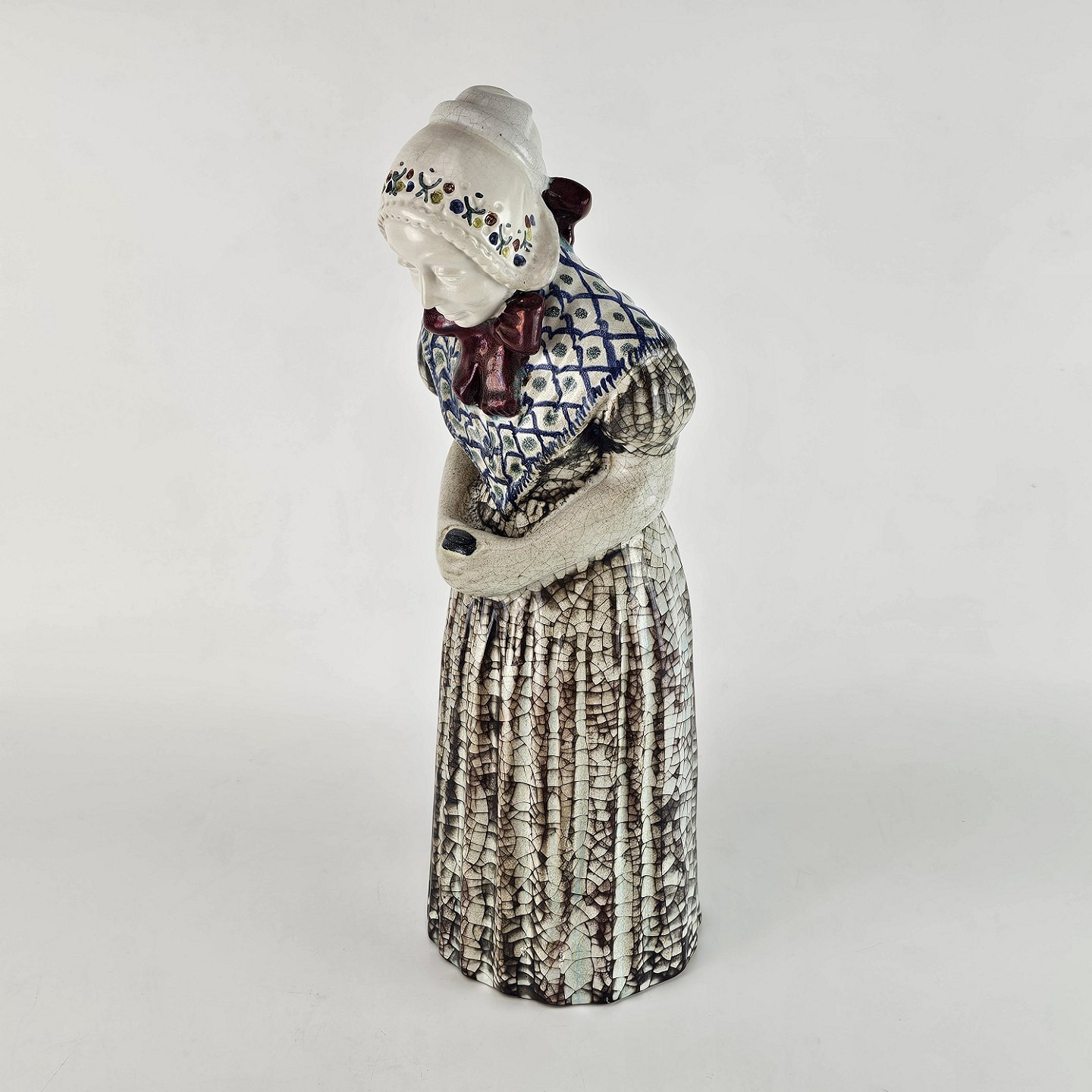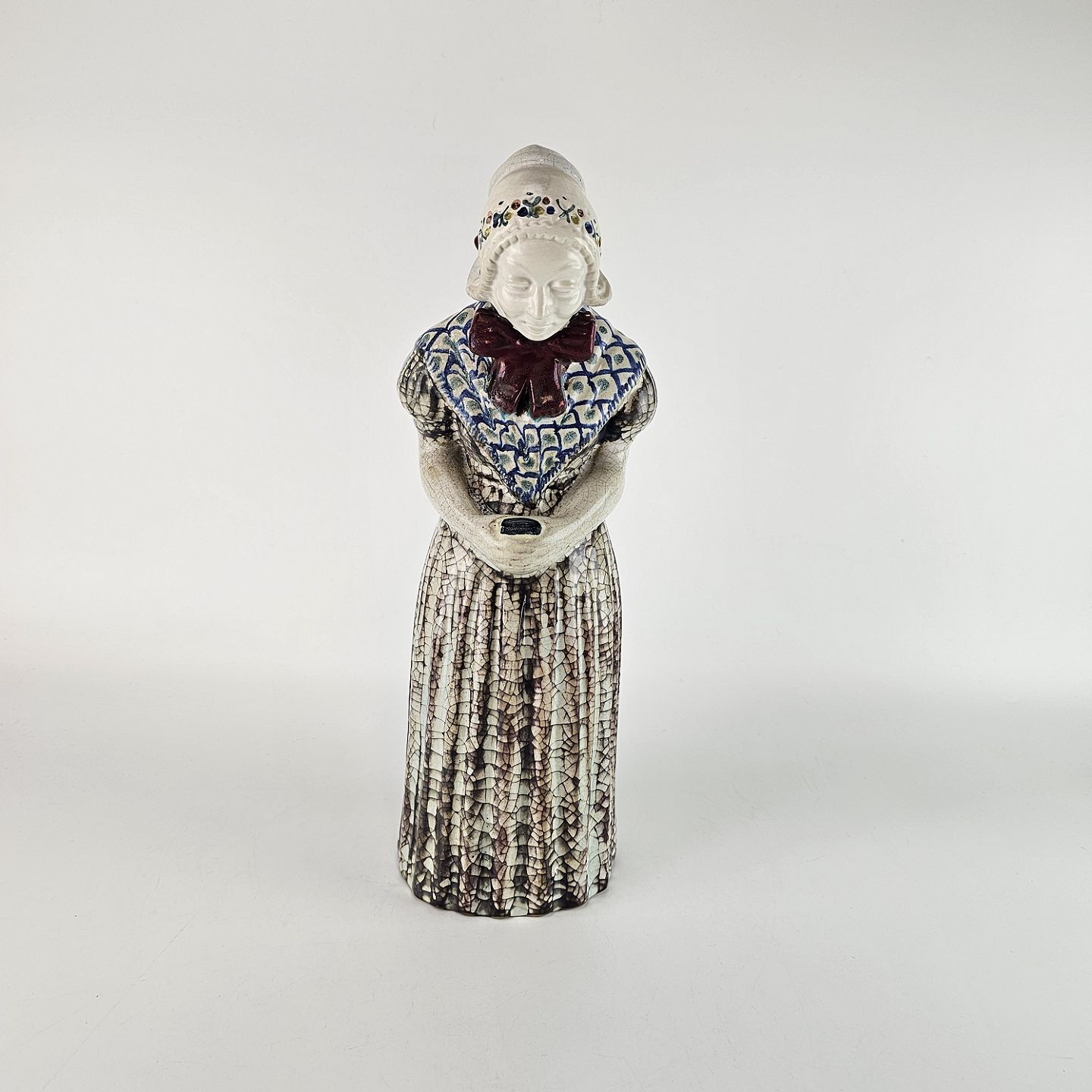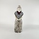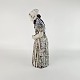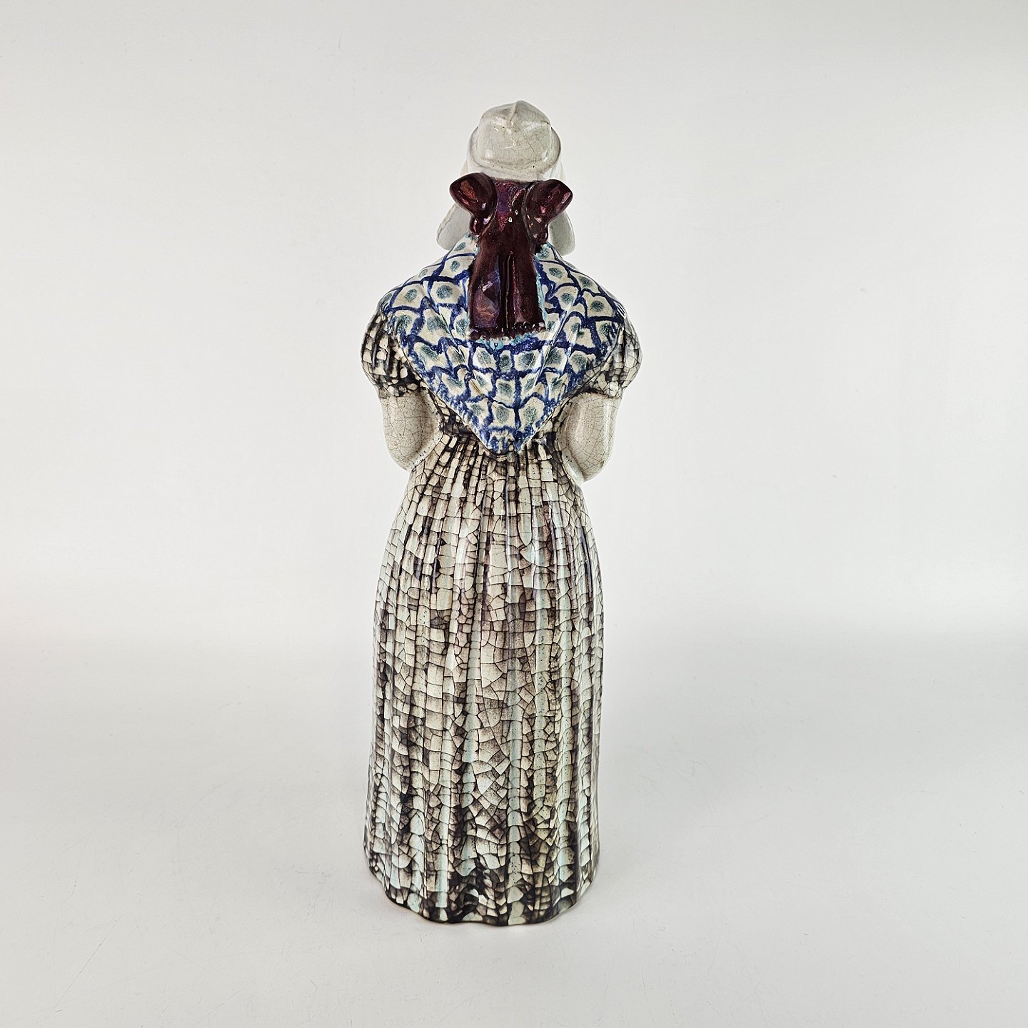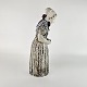 Figur af keramik, med motiv af en kvinde i folkedragt, som kigger ned ad. Med flot krakeleret look og signeret i bunden.