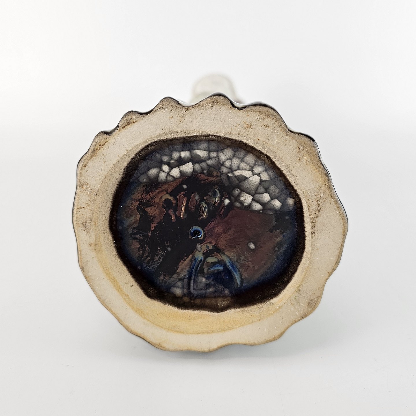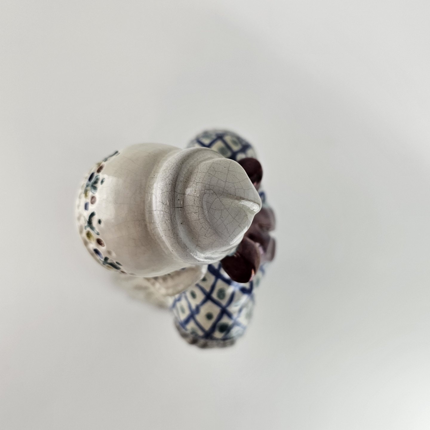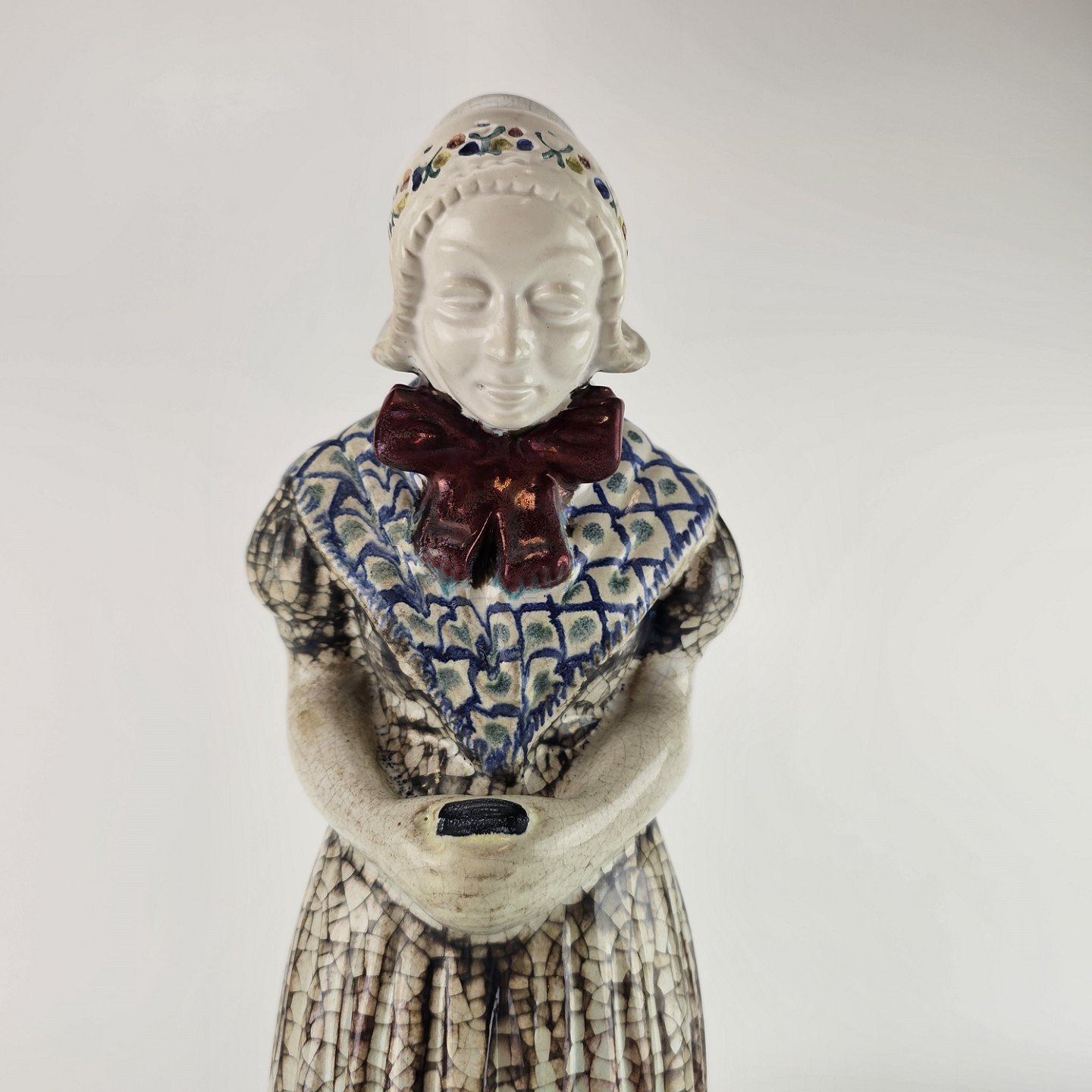 Figur af keramik, med motiv af en kvinde i folkedragt, som kigger ned ad. Med flot krakeleret look og signeret i bunden.