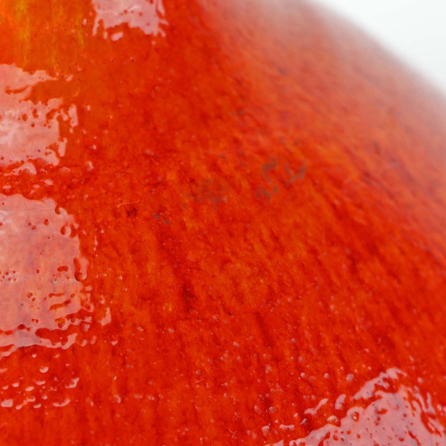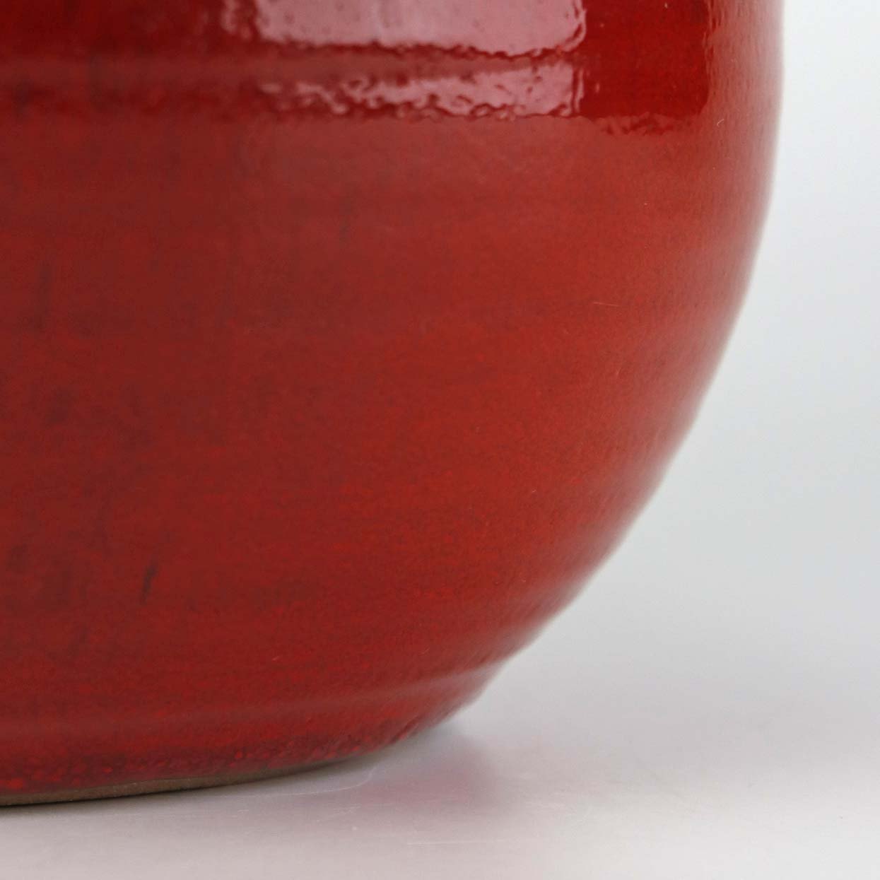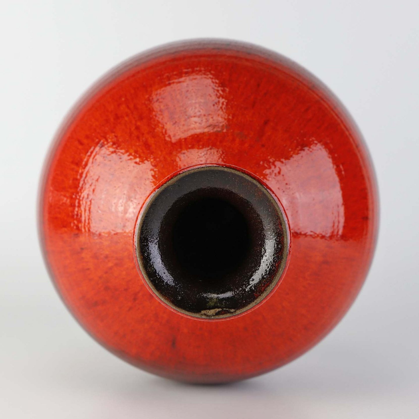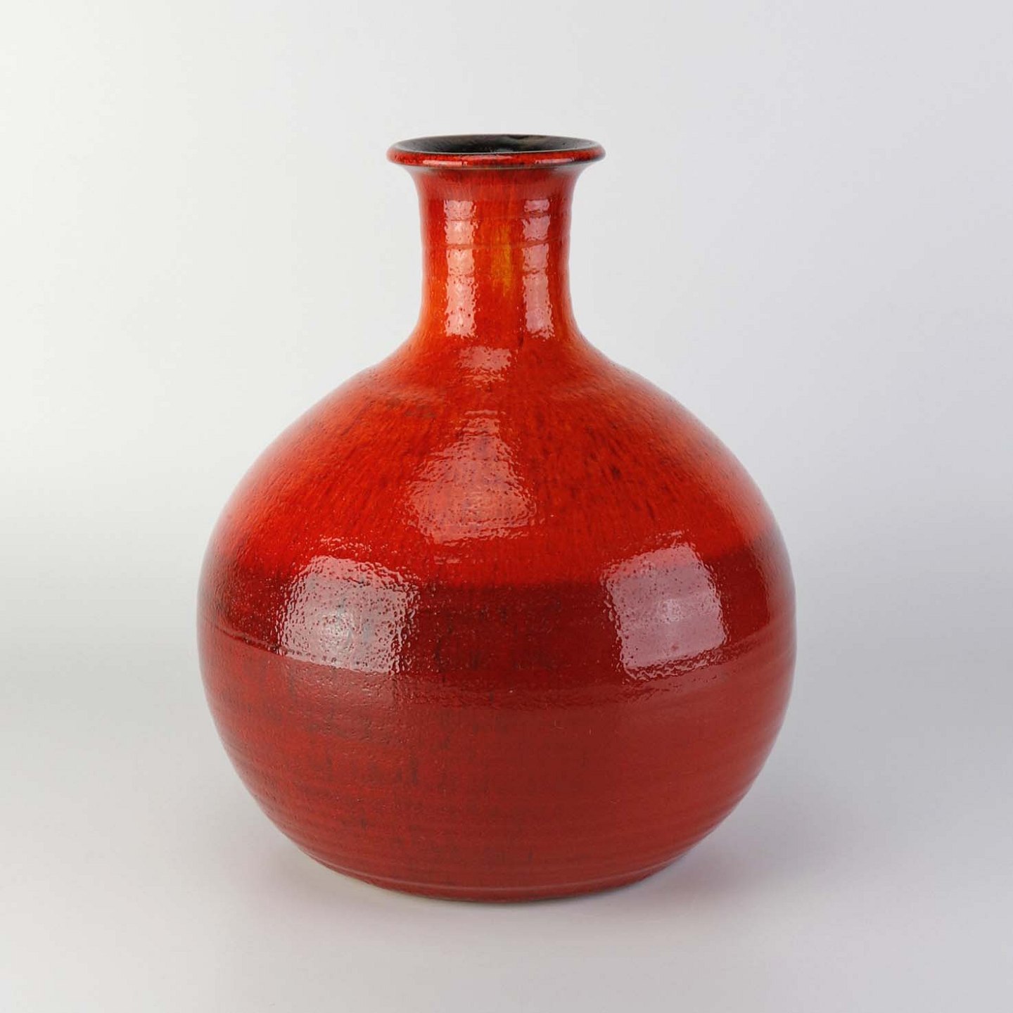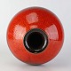 Rund vase i keramik med slank hals og let rillet mønster. Vasen er med rød og orange glasering.