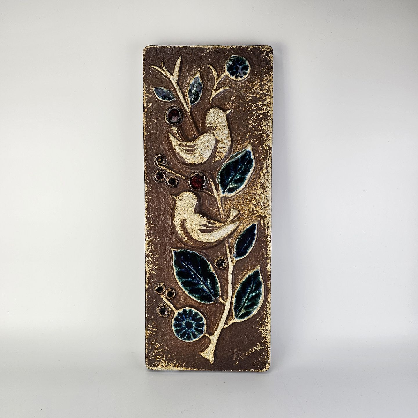 Relief i glaseret stentøj med motiv af to fugle på en gren