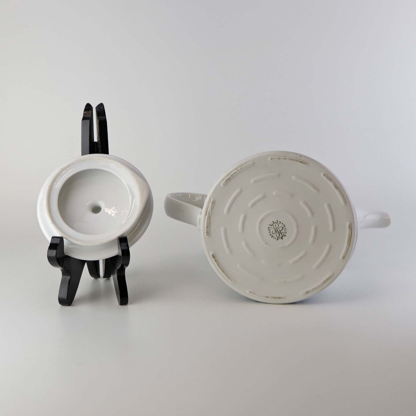 Stellet er fremstillet i ildfast glat porcelæn dekoreret med mørkeblå tangenter på hvid baggrund.