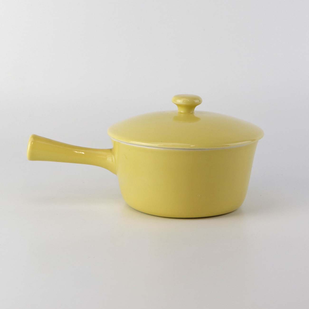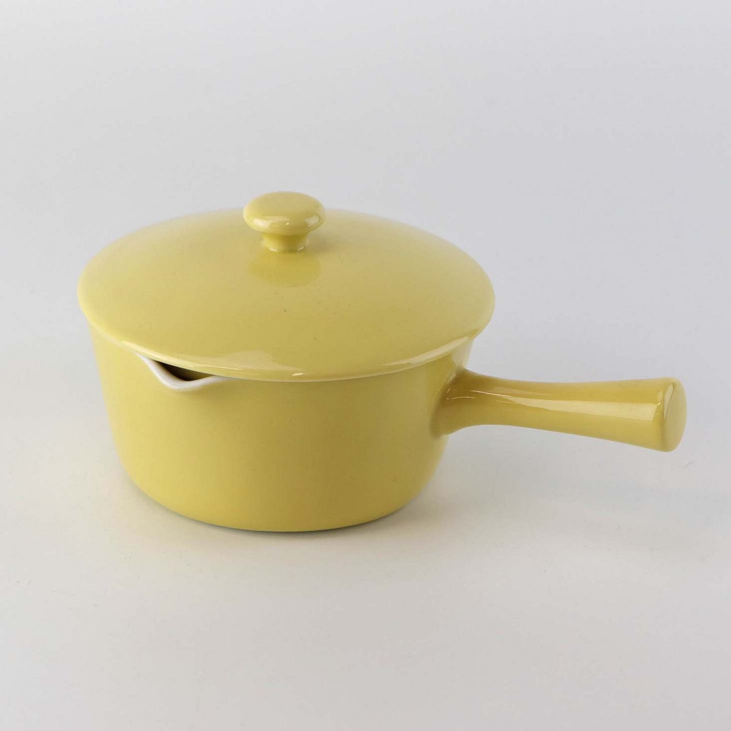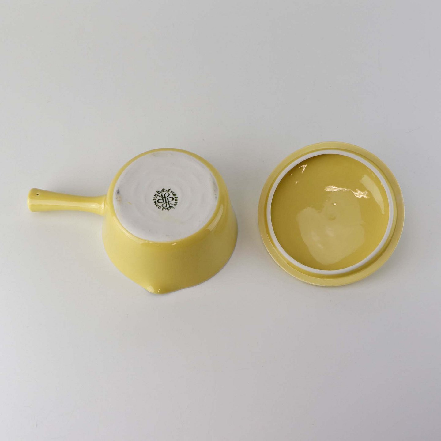 Smørkande med låg og hank i porcelæn fra stellet Gul glasurfarvet.