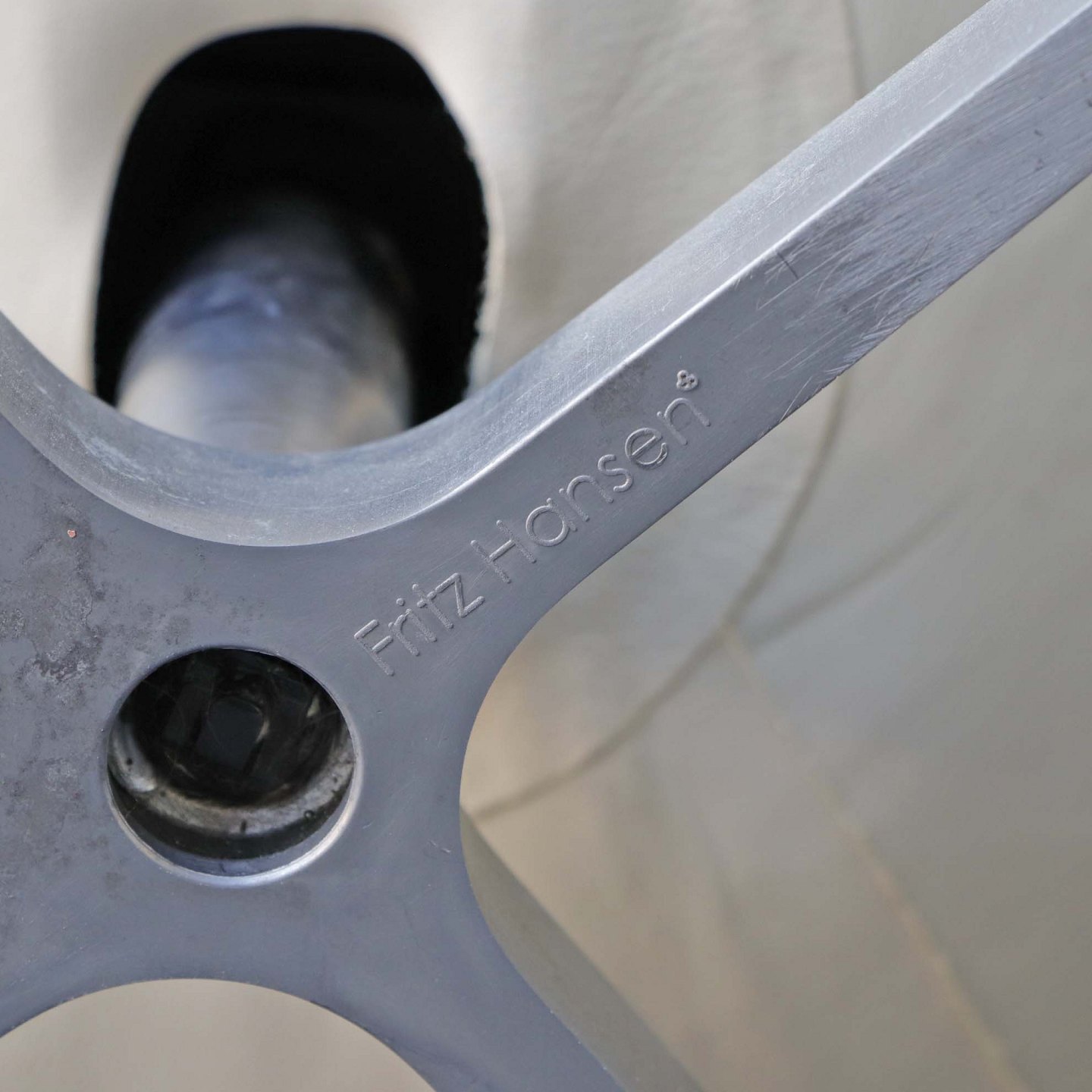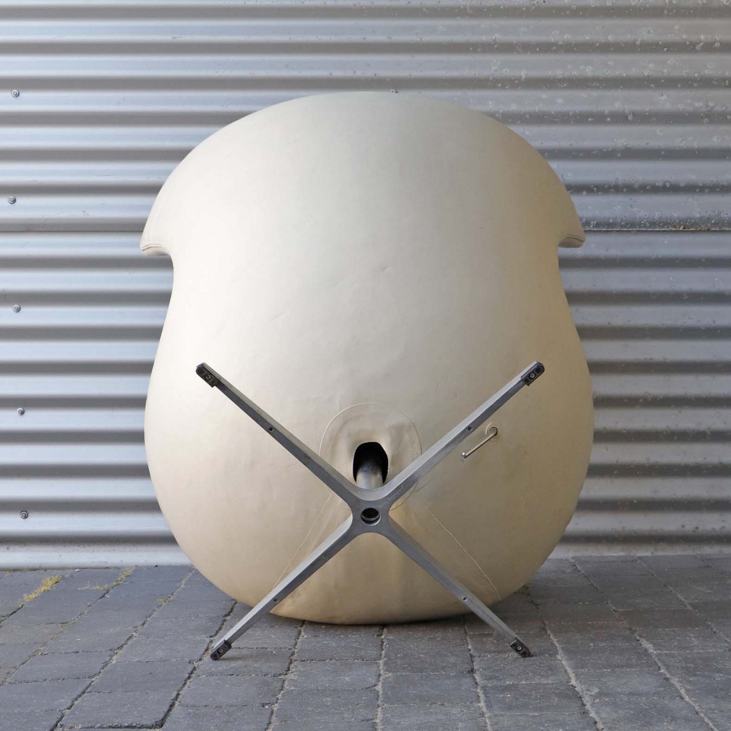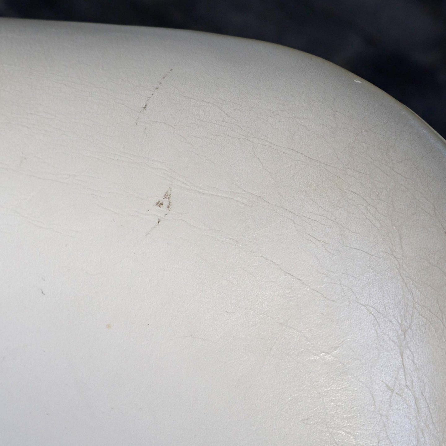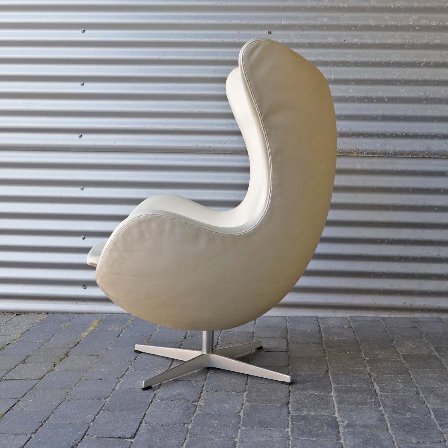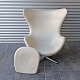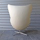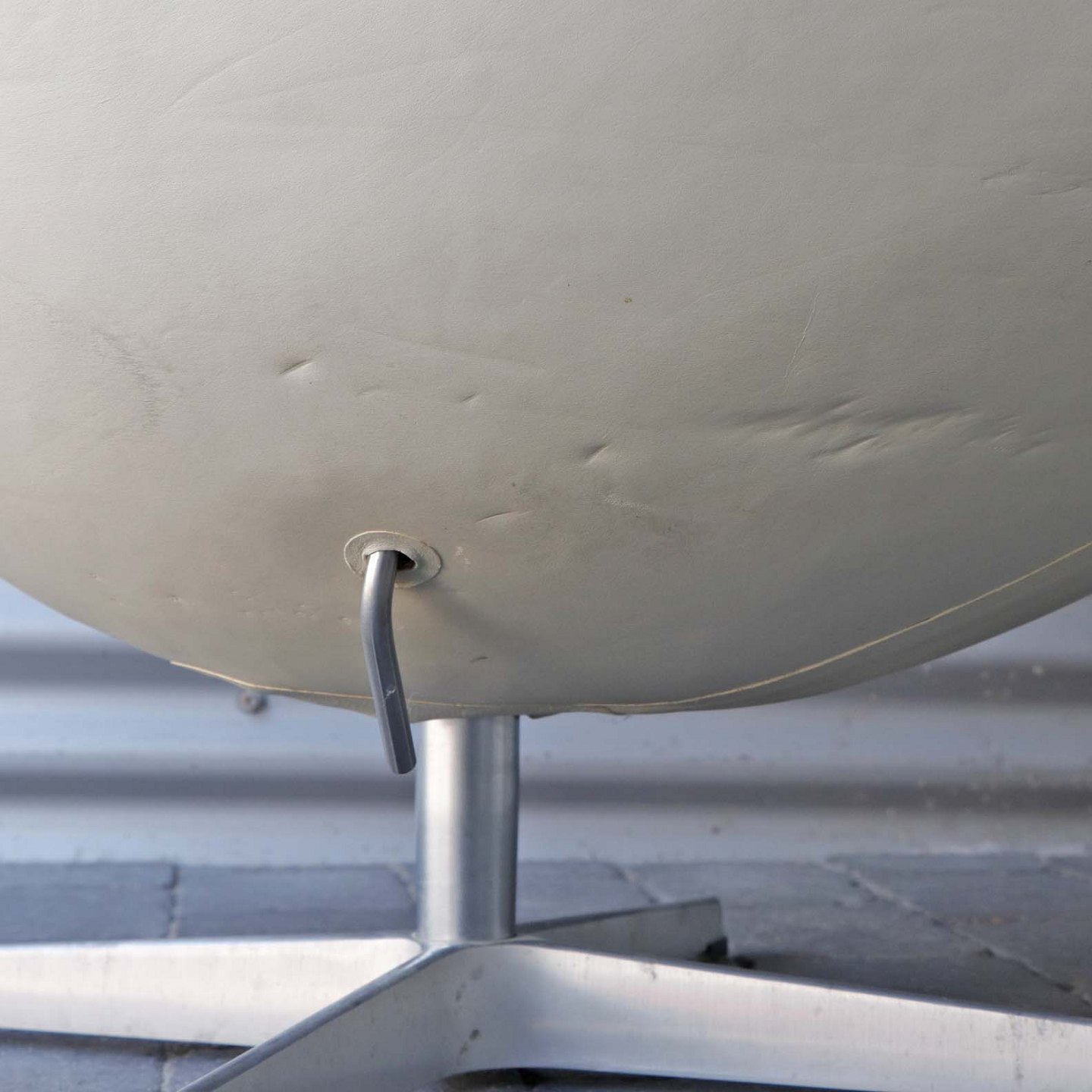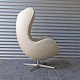 Lænestol med siddehynde som er betrukket med klassisk hvidt læder på fod i aluminium med sorte dupper. Stolen er udstyret med returdrej og vip. Model Ægget