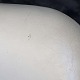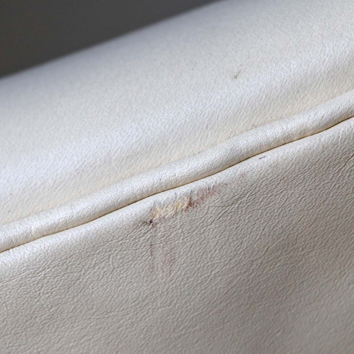 Fremstår med indrykninger i læderet på bagsiden og under stolen, samt enkelte steder med mørkere brugsspor ved armlæn og topkant samt lille område på ydersiden af stolen med let slid. Stolens fod fremstår med lettere ridser og områder med misfavning.