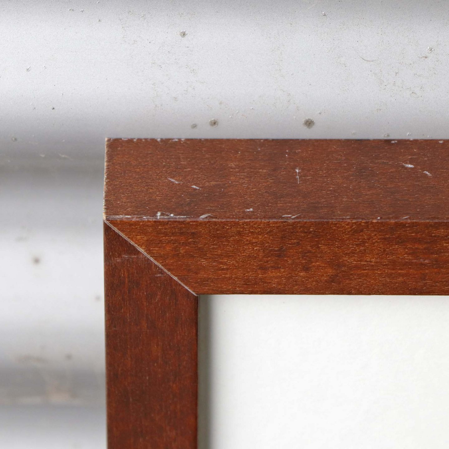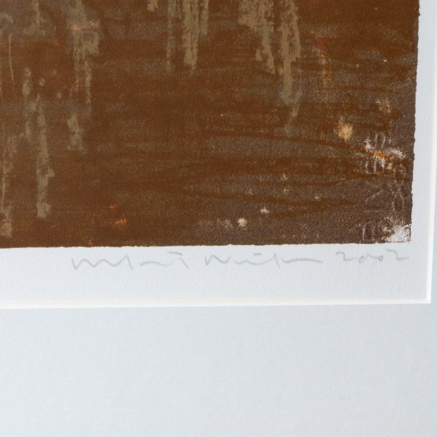 Indrammet litografi med passepartout i mørkmalet træramme med abstrakt motiv i jordfarver fra år 2002. Nr. 45 af 280 eksemplarer.
