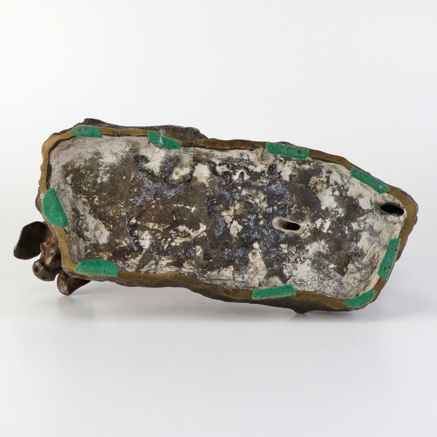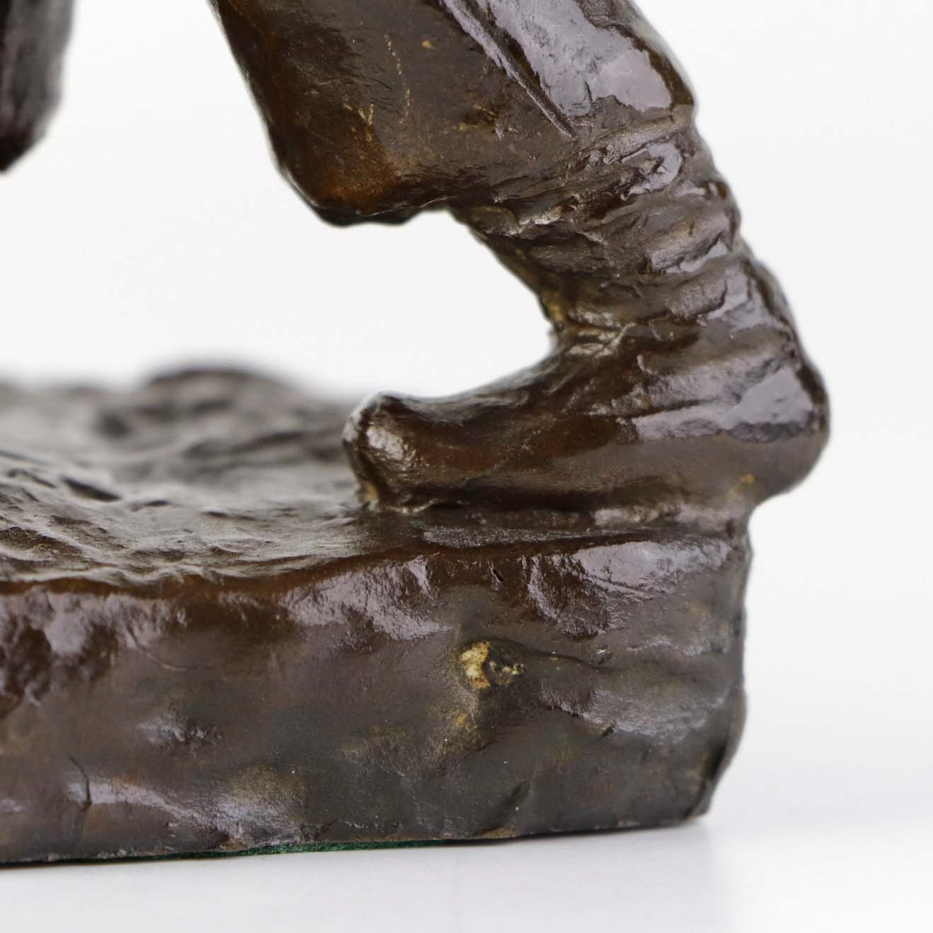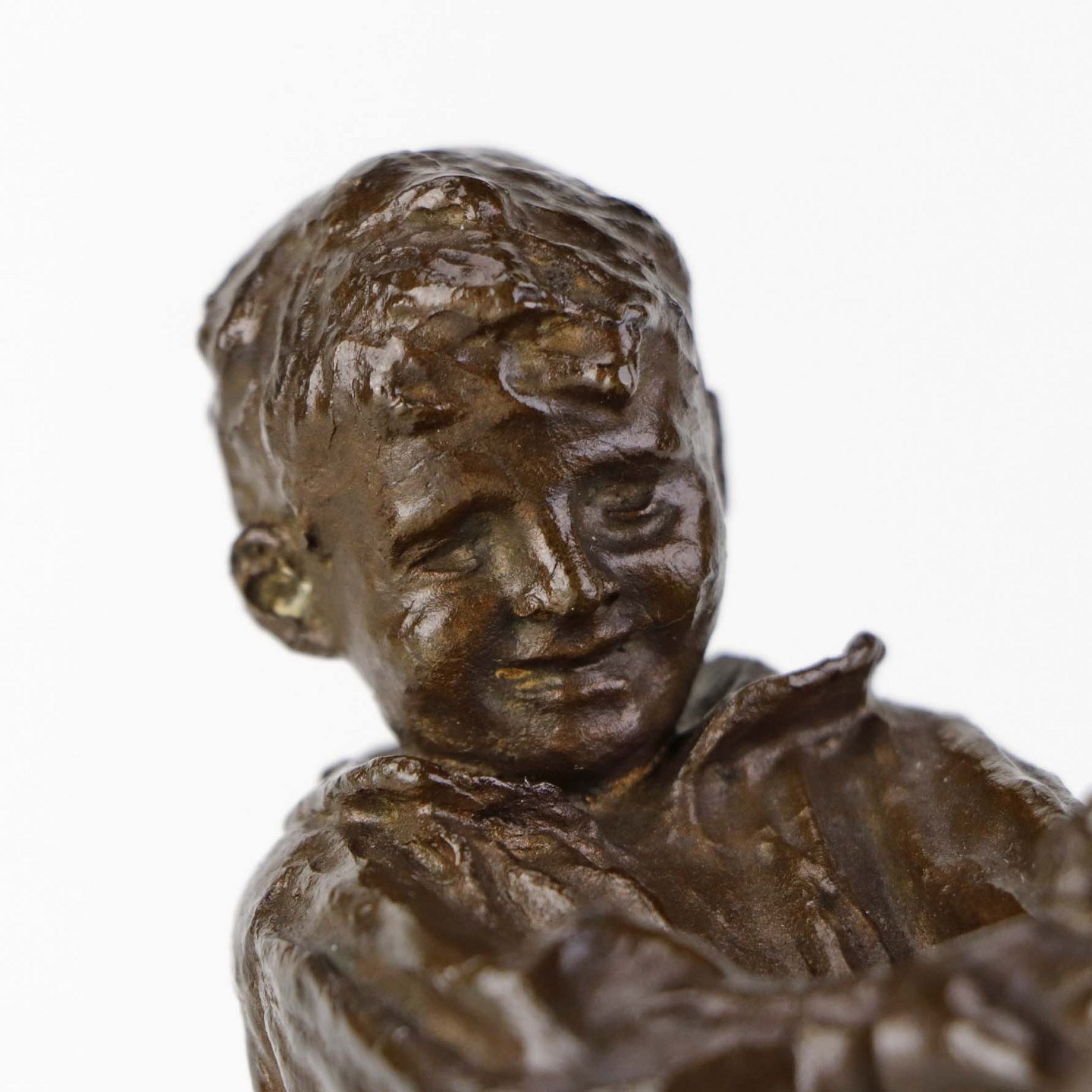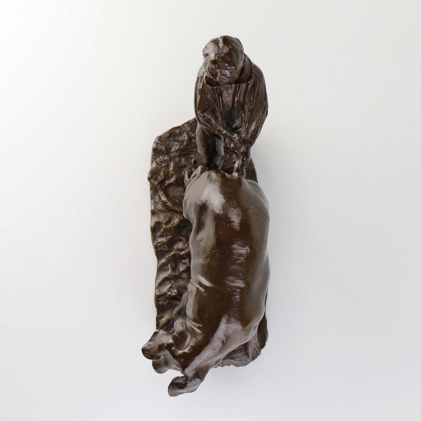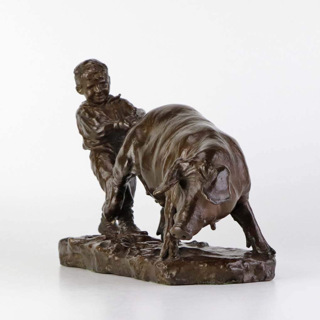 Figur i brunmalet bronze med motiv af dreng, som trækker en gris i halen.