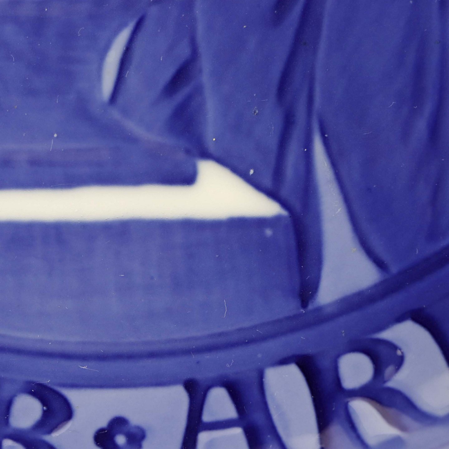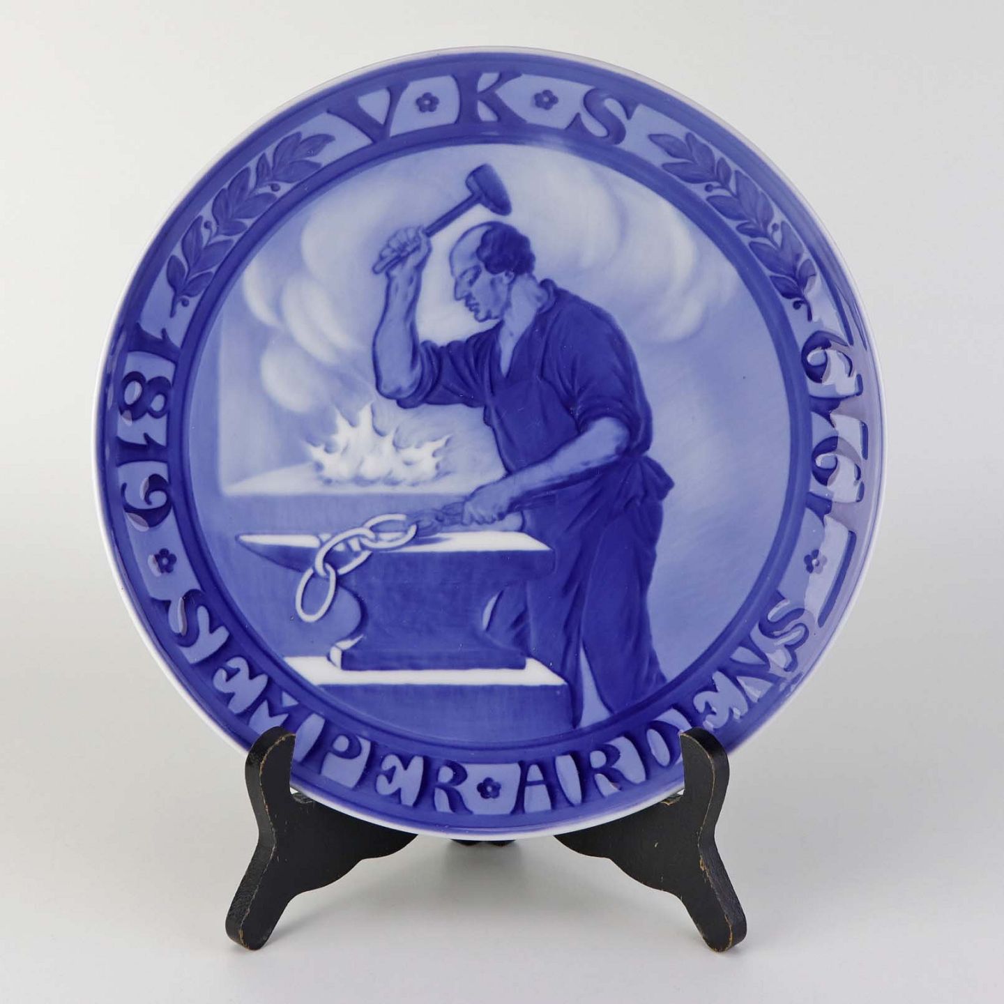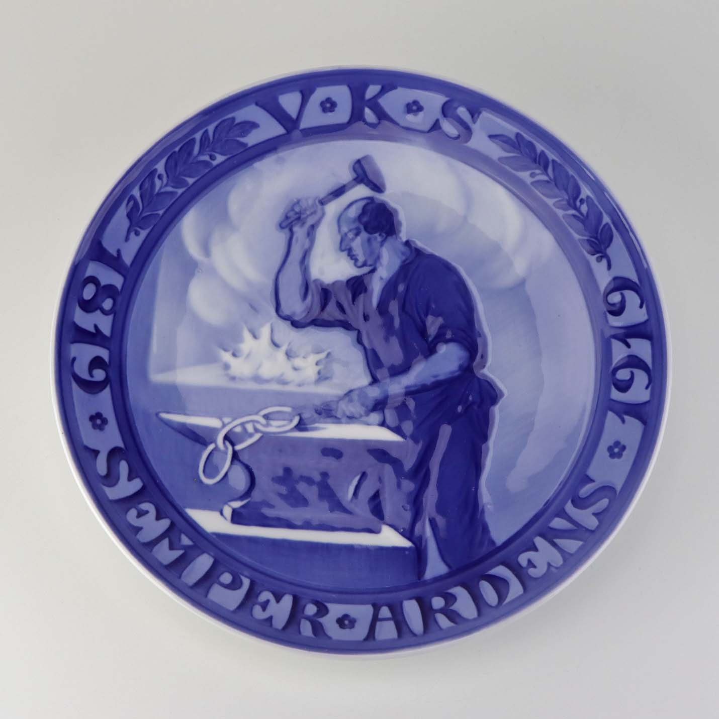 Mindeplatte i porcelæn med motiv af en smed, som fremstiller Odd Fellow logens tre ringe med teksten V.K.S., Semper Ardens, 1819-1919. Platten er fremstillet i 1500 eksemplarer. Nr. 178