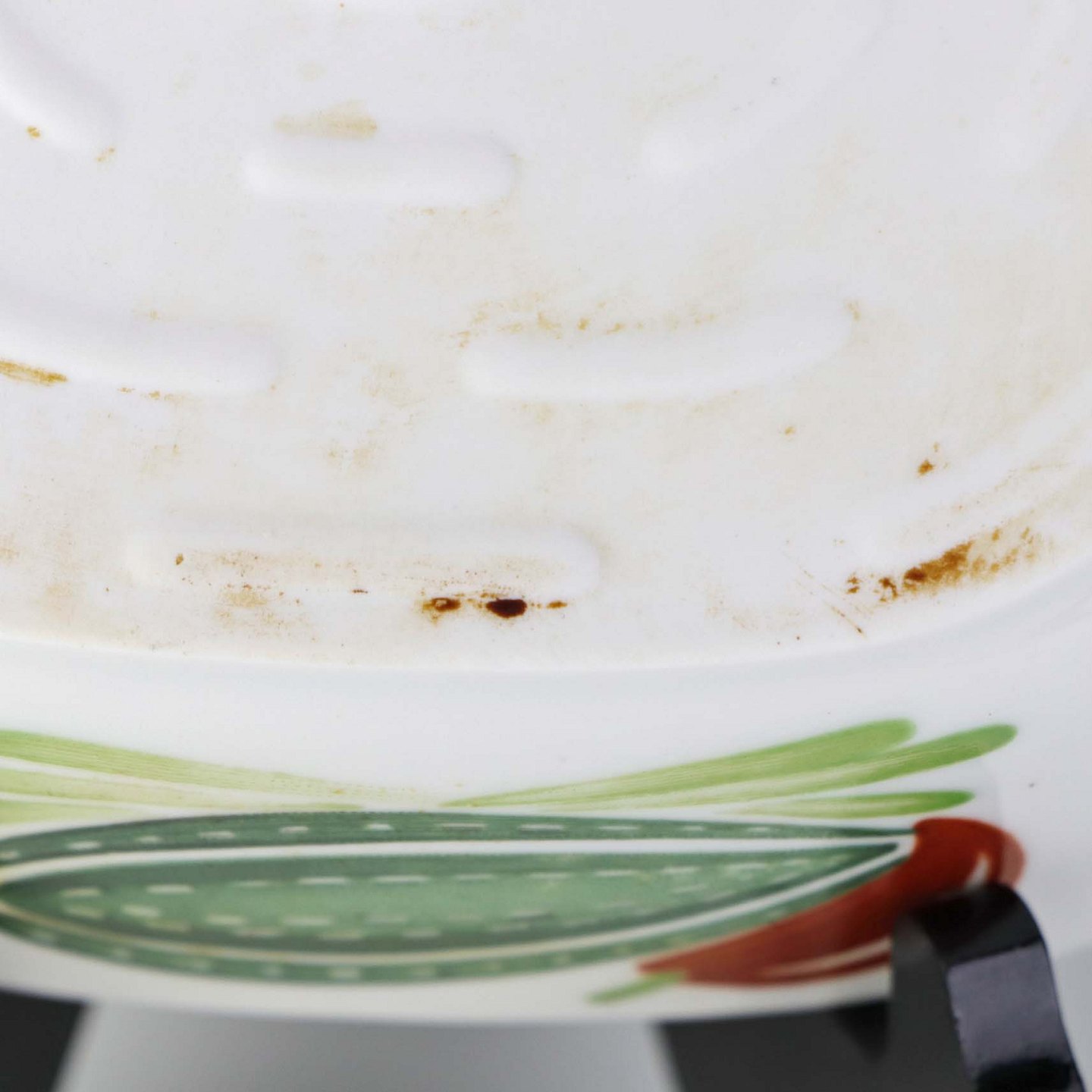 Stellet er i glat hvidt porcelæn med varierende farverige motiver af frugter og grønt.