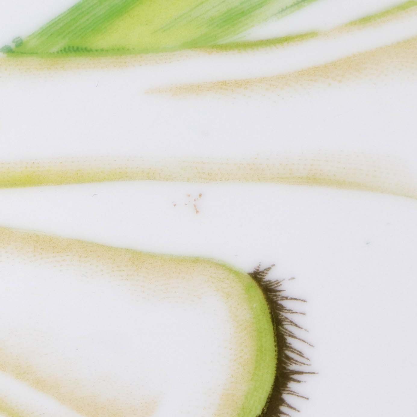 Stellet er i glat hvidt porcelæn med varierende farverige motiver af frugter og grønt.