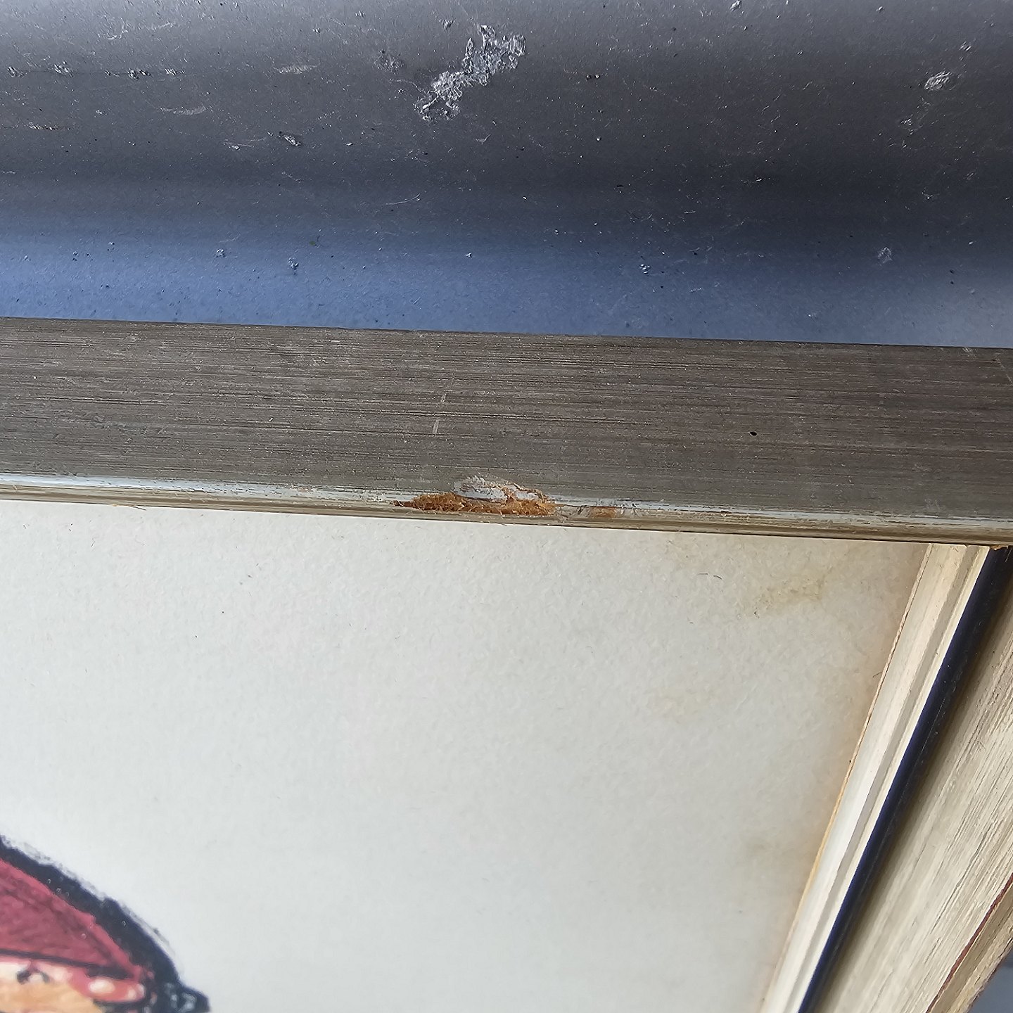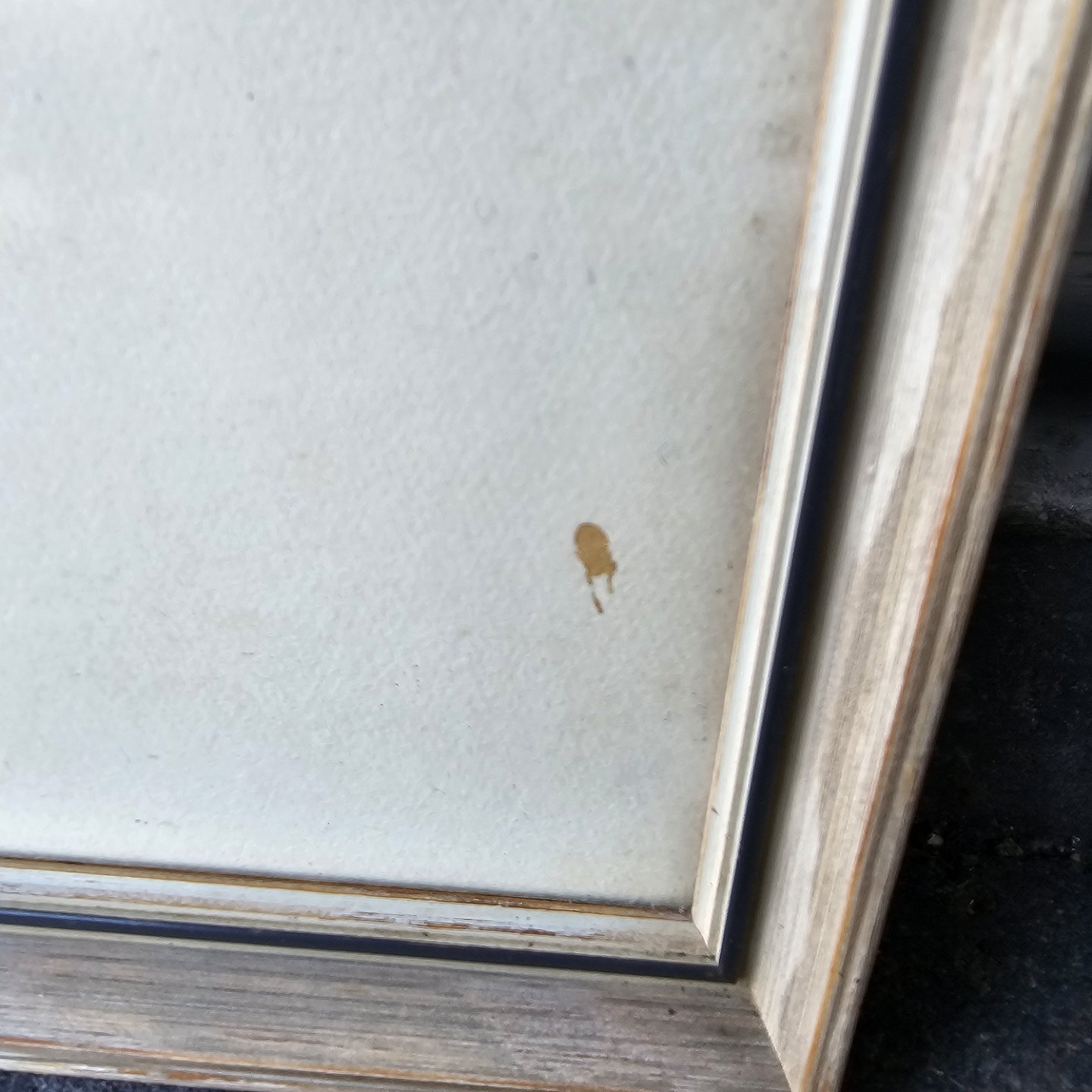 Fremstår med en lille plet på forsiden, en større plet på bagsiden, og en skramme på rammen