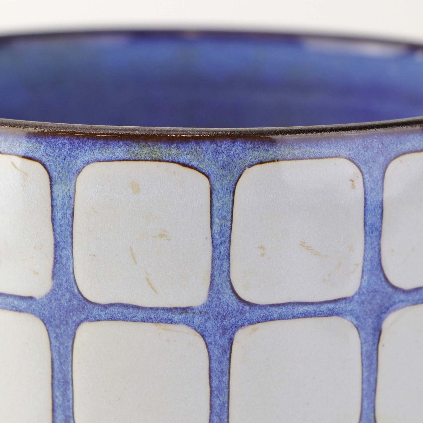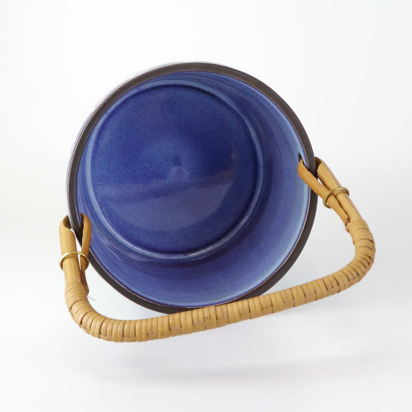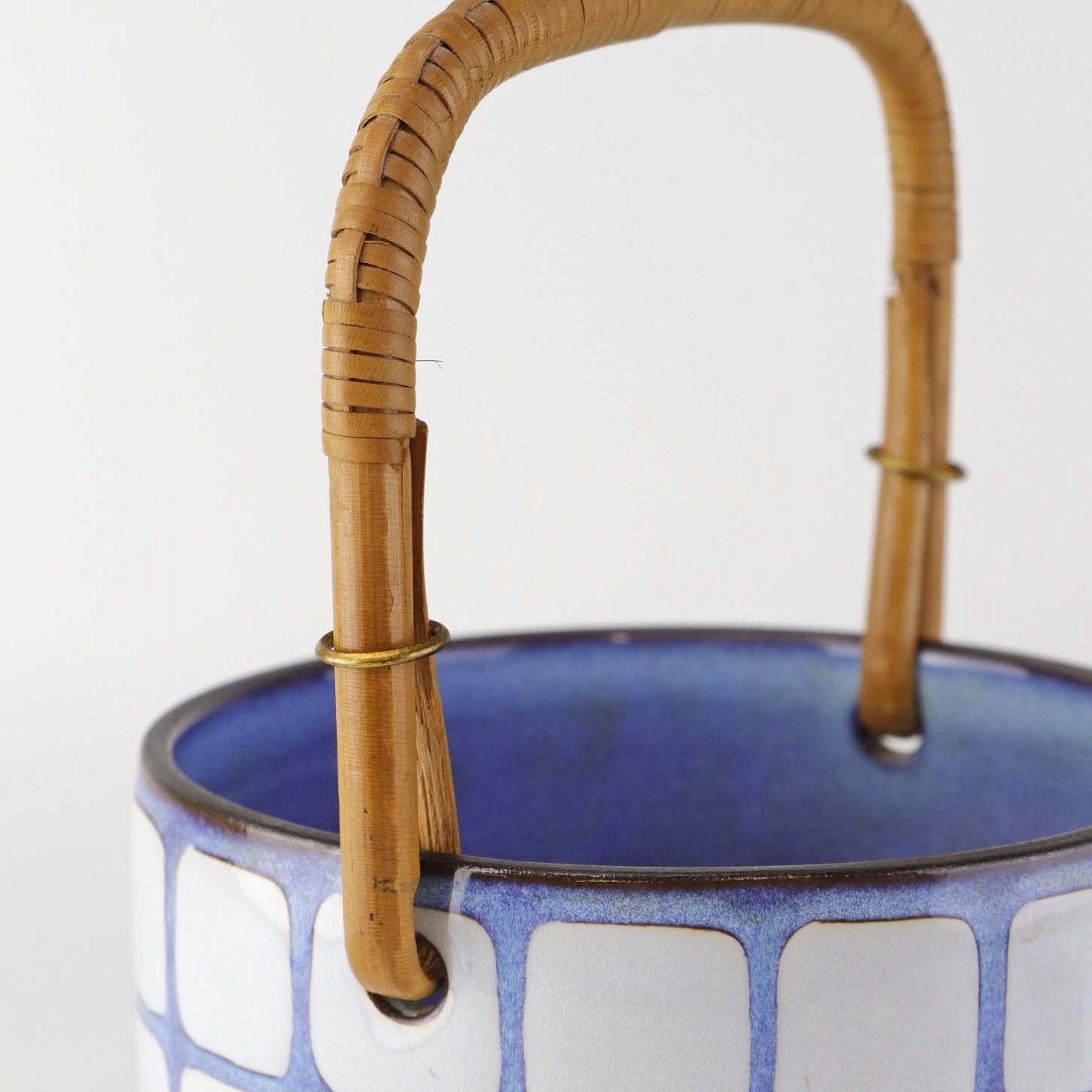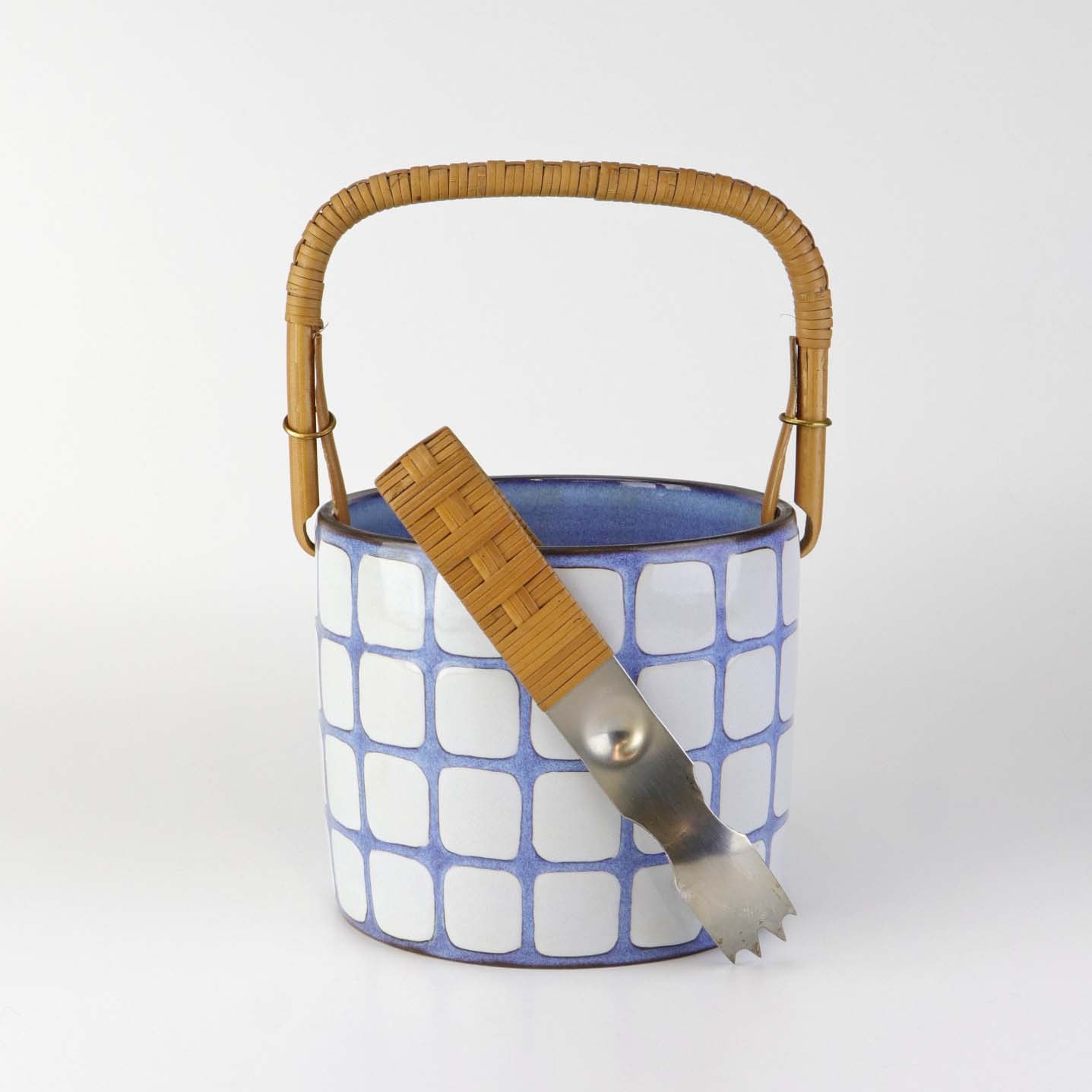 Isspand i lyseblå fajance med hvide tern og tilhørende tang i metal. Spandens hank og grebet på tangen er lavet af bambusflet. Nr. 3310