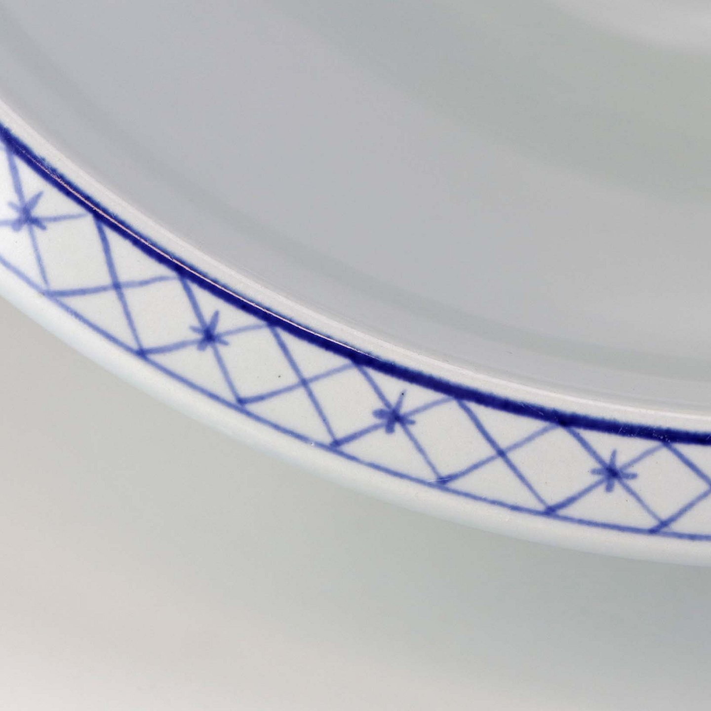 Glat hvid fajance med blå dekoration af blomster og blå bort.