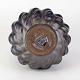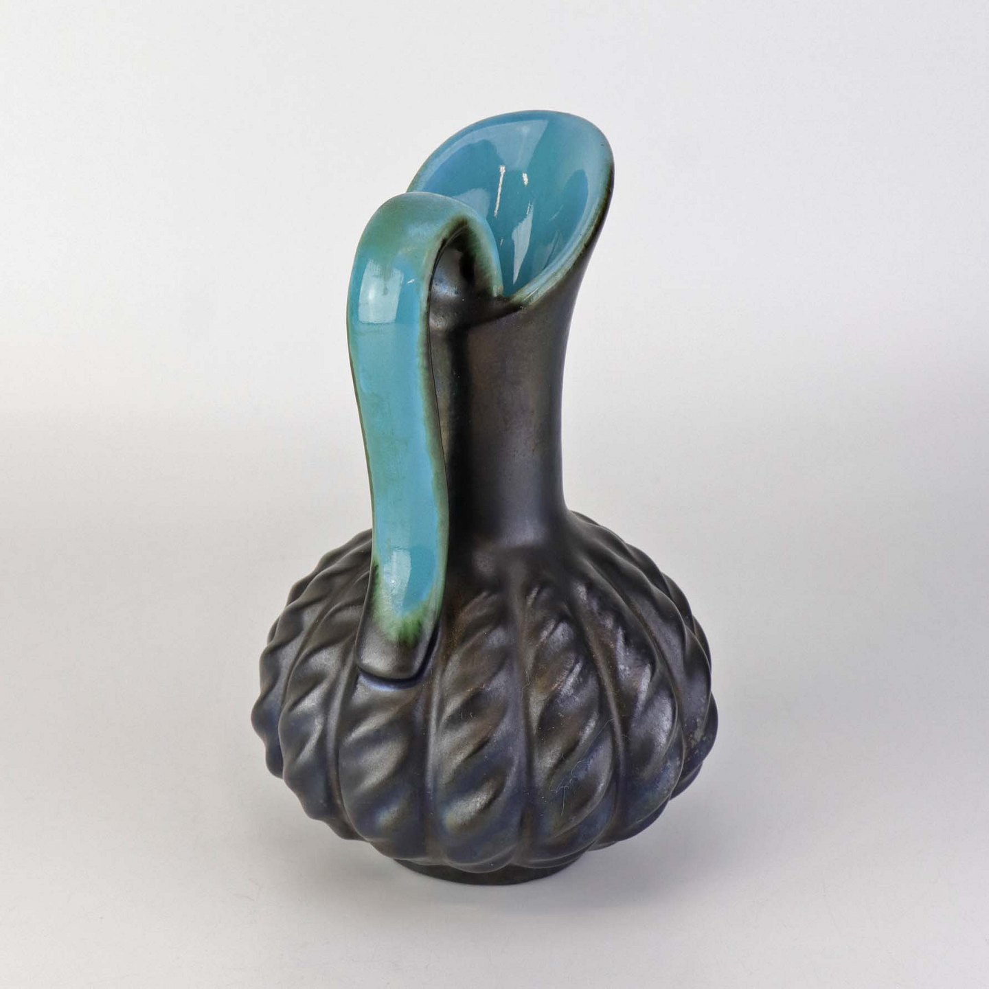 Kande i keramik med indvendig turkis glasering og udvendig mørk og delvist metallisk glasering.