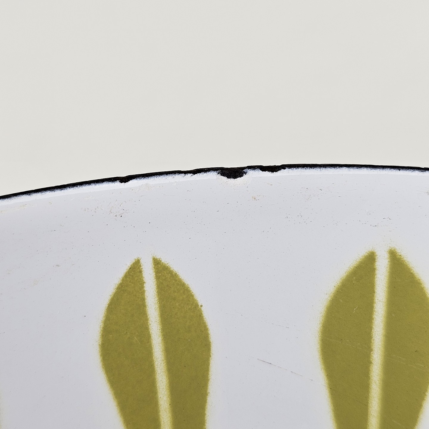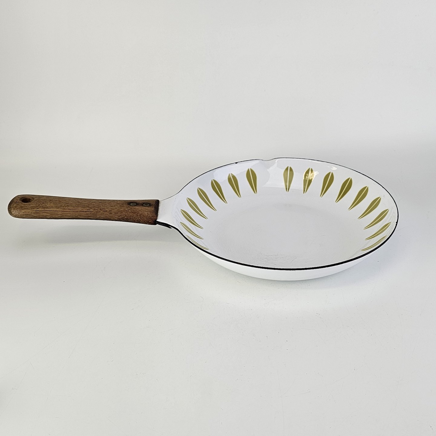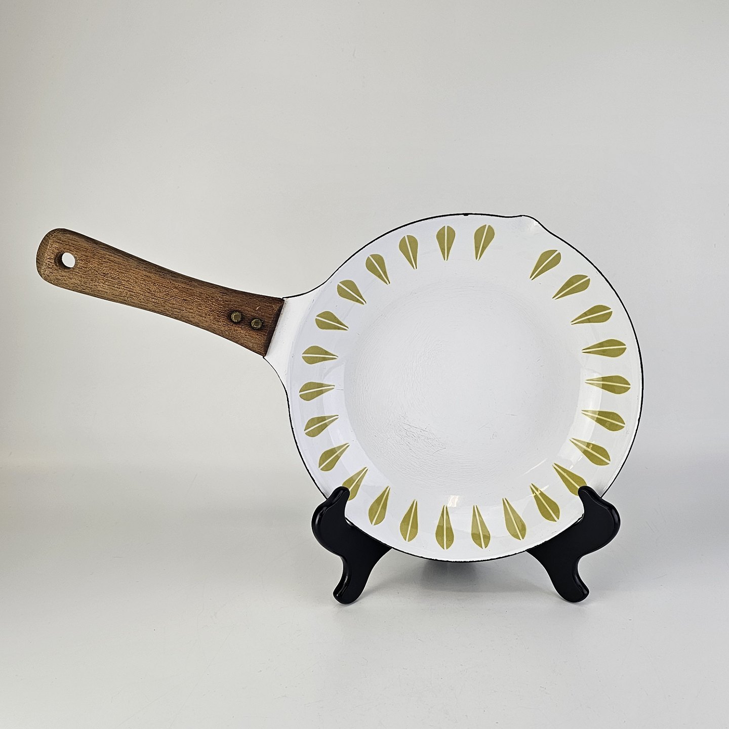 Lotus emalje pande med grønt motiv og håndtag i træ