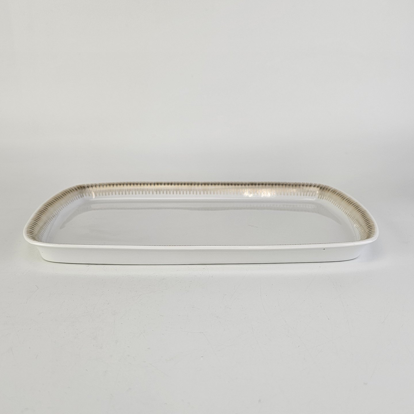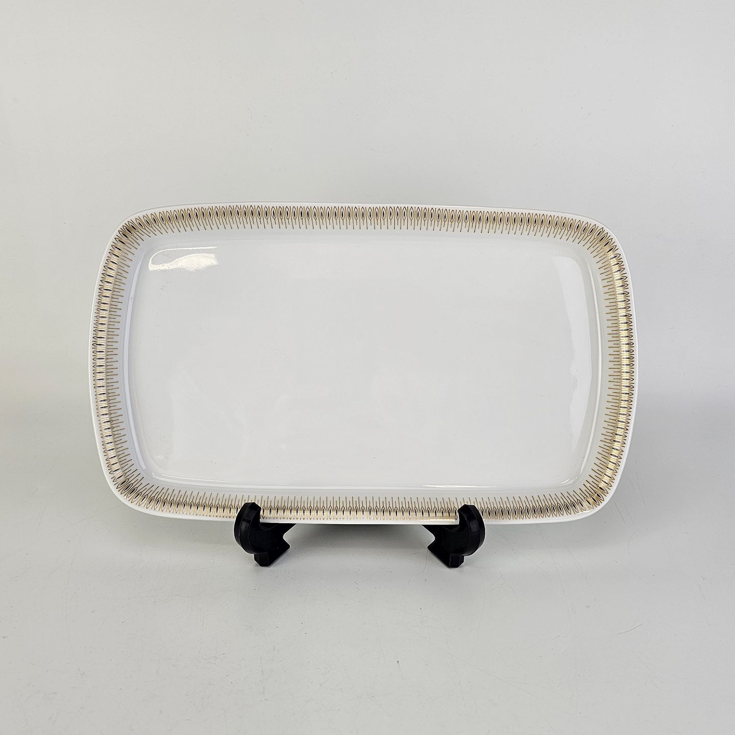 Lille rektangulært fad i hvidt porcelæn med dekoration i guld fra stellet Trend 1220