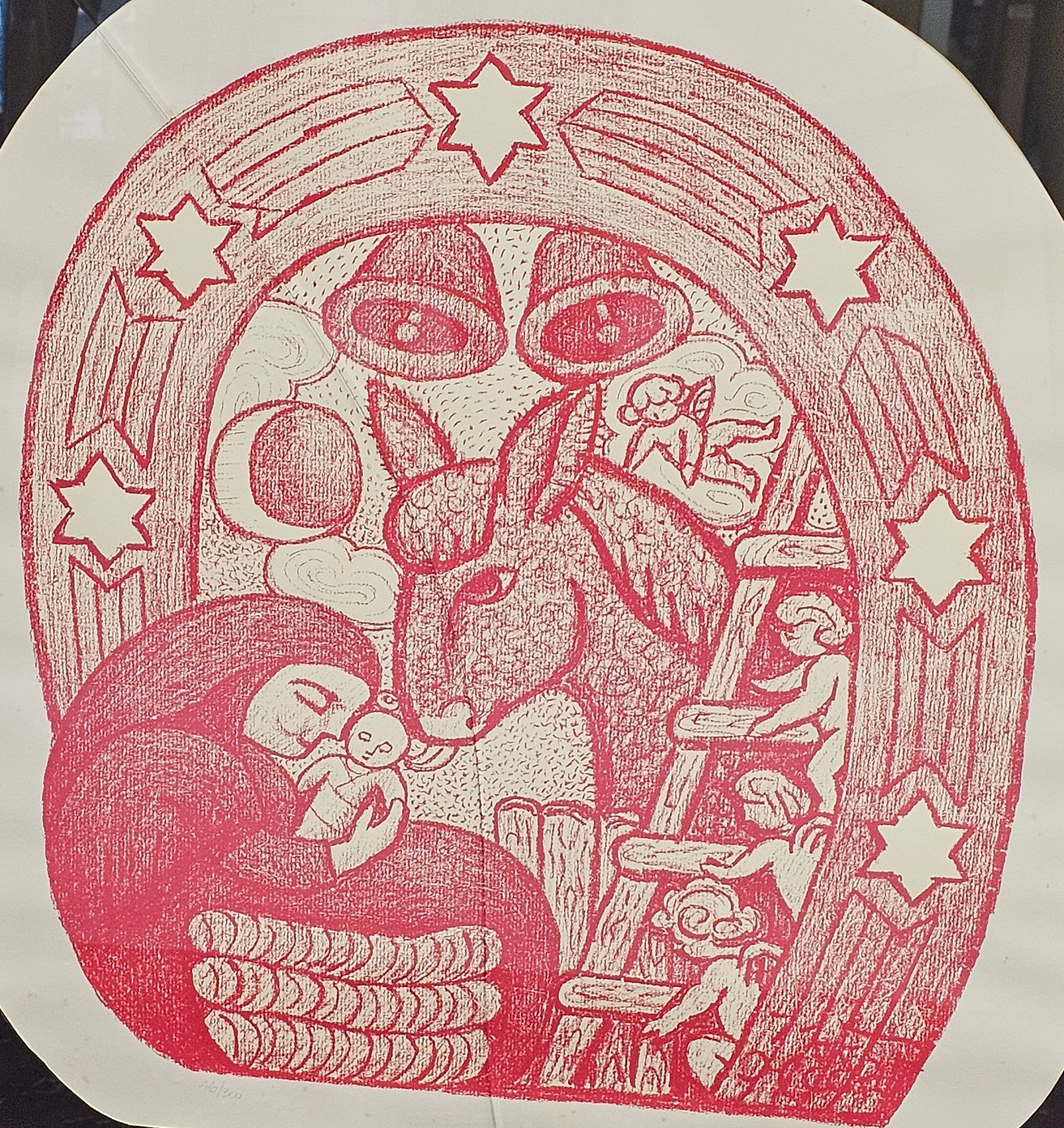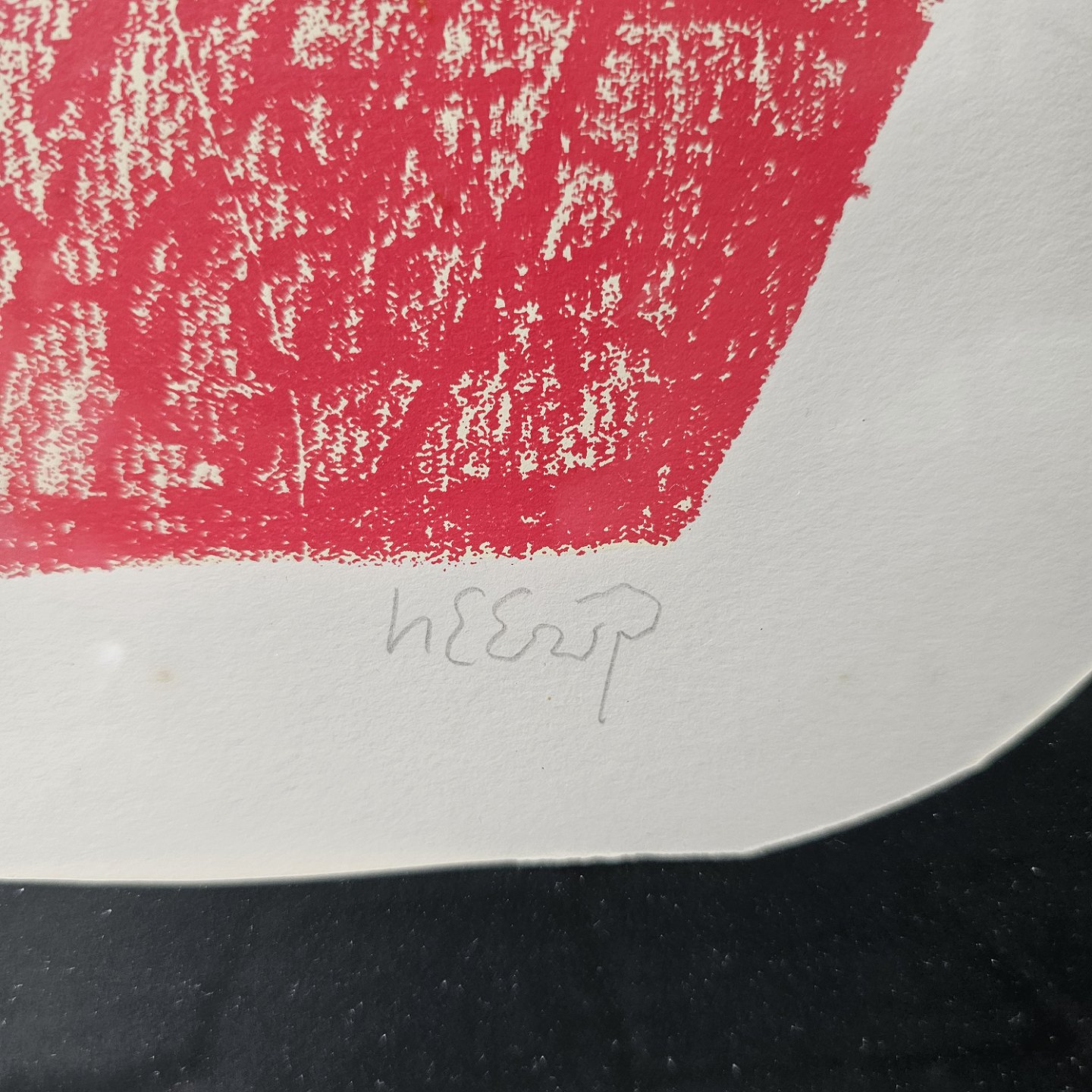 Indrammet litografi på sort baggrund med hvid ramme