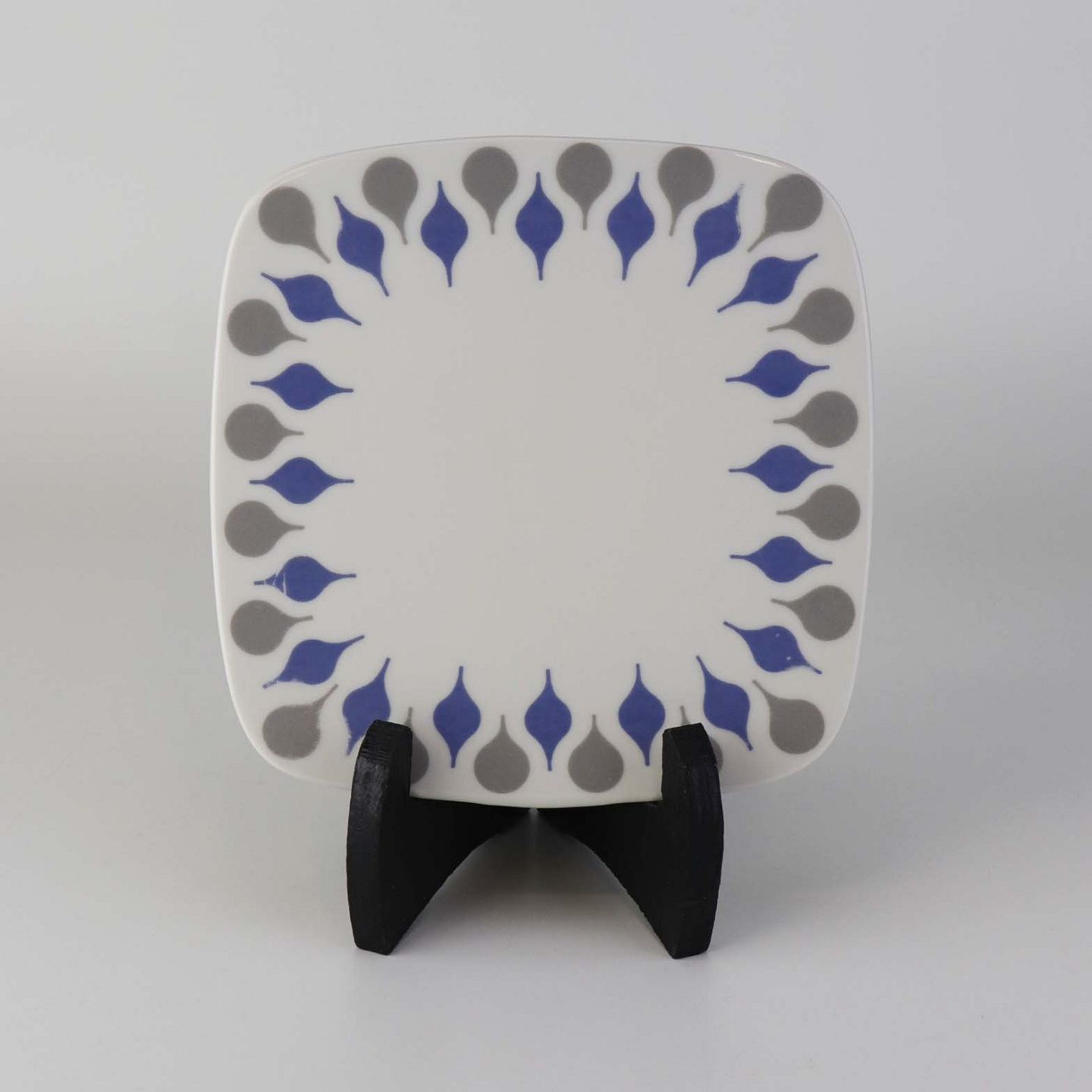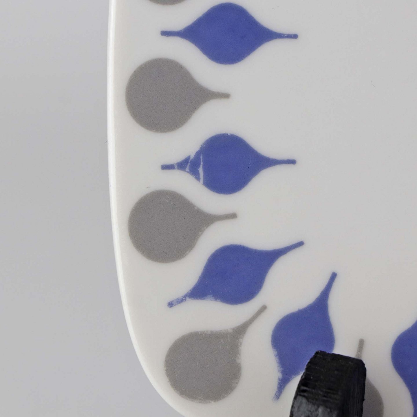 Stel produceret i perioden 1961-69 fremstillet i glat hvidt porcelæn dekoreret med blå og grå dråber.