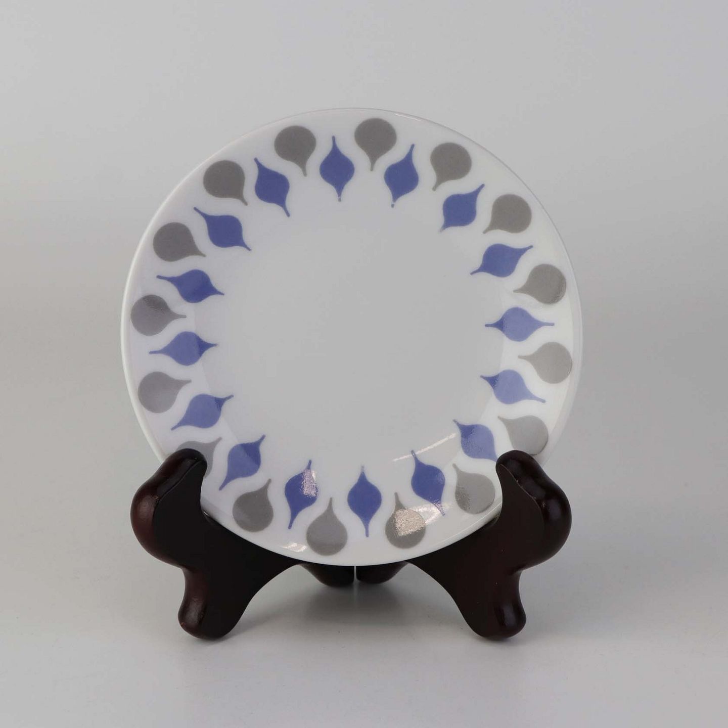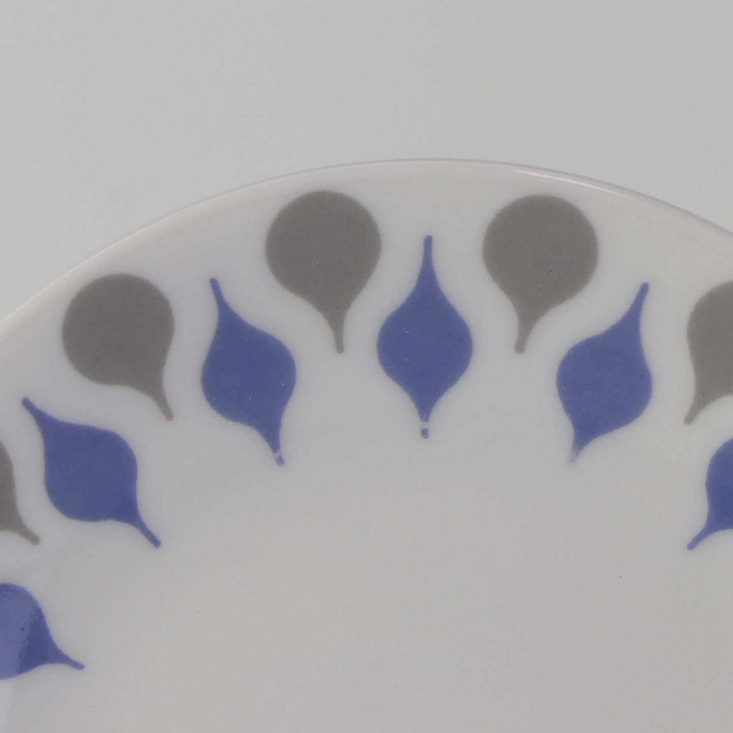 Stel produceret i perioden 1961-69 fremstillet i glat hvidt porcelæn dekoreret med blå og grå dråber.