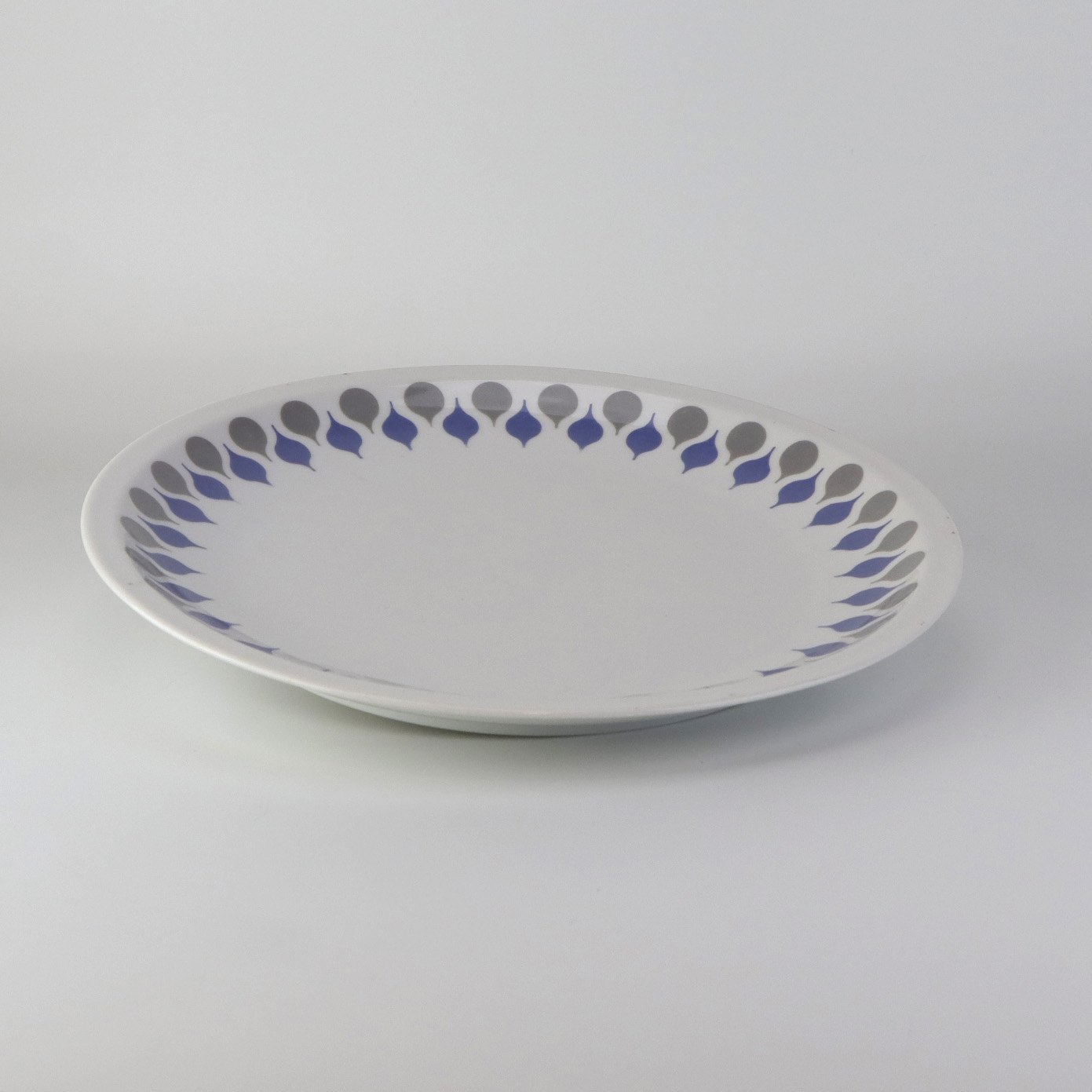 Stel produceret i perioden 1961-69 fremstillet i glat hvidt porcelæn dekoreret med blå og grå dråber.