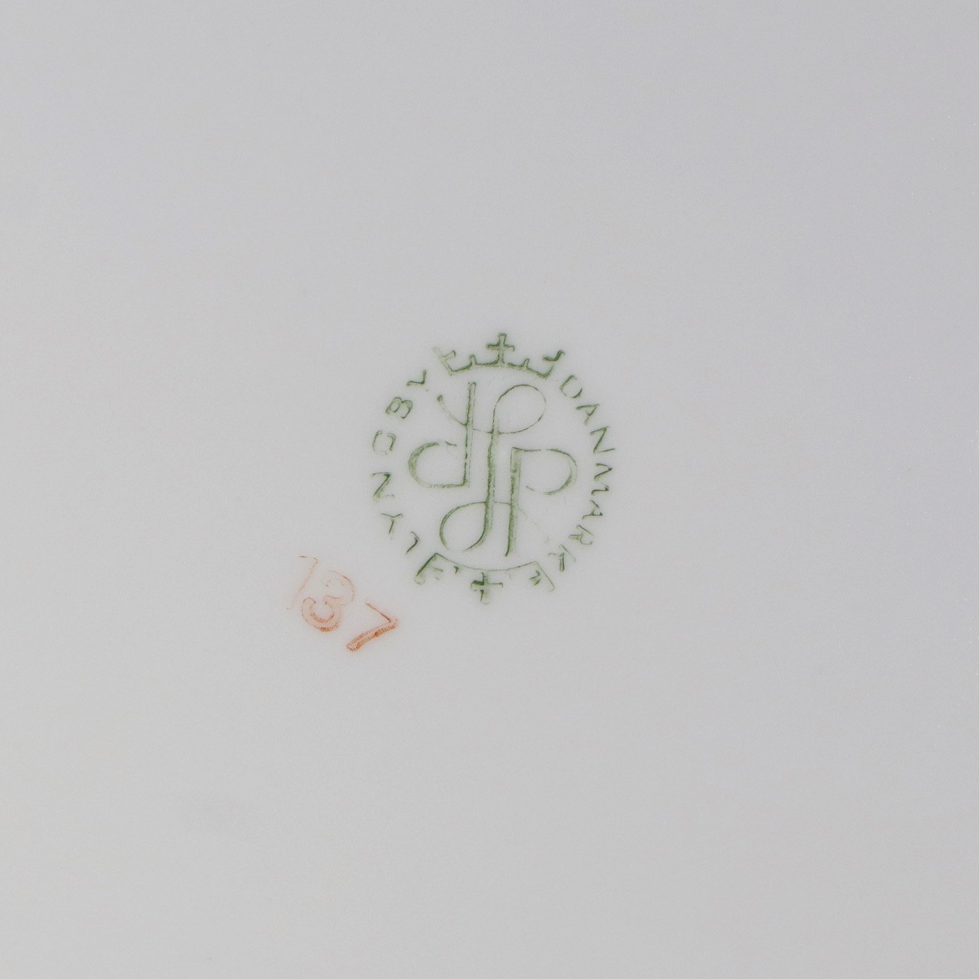 Fremstår med lettere brugsspor på dekorationen, små pletter ved kanten samt lettere slid glasuren på frontsiden.