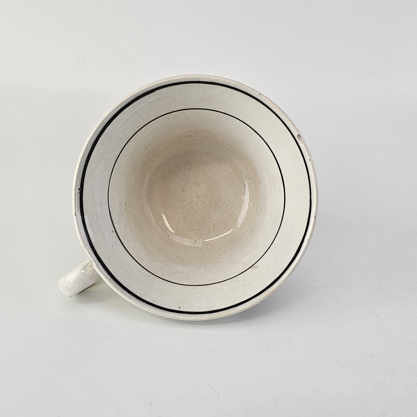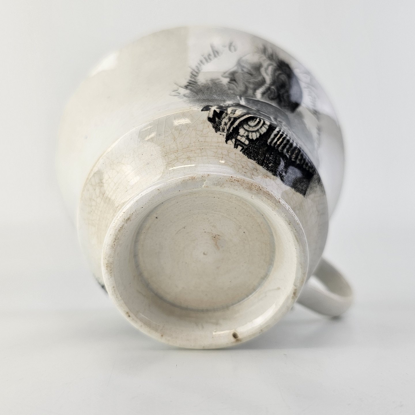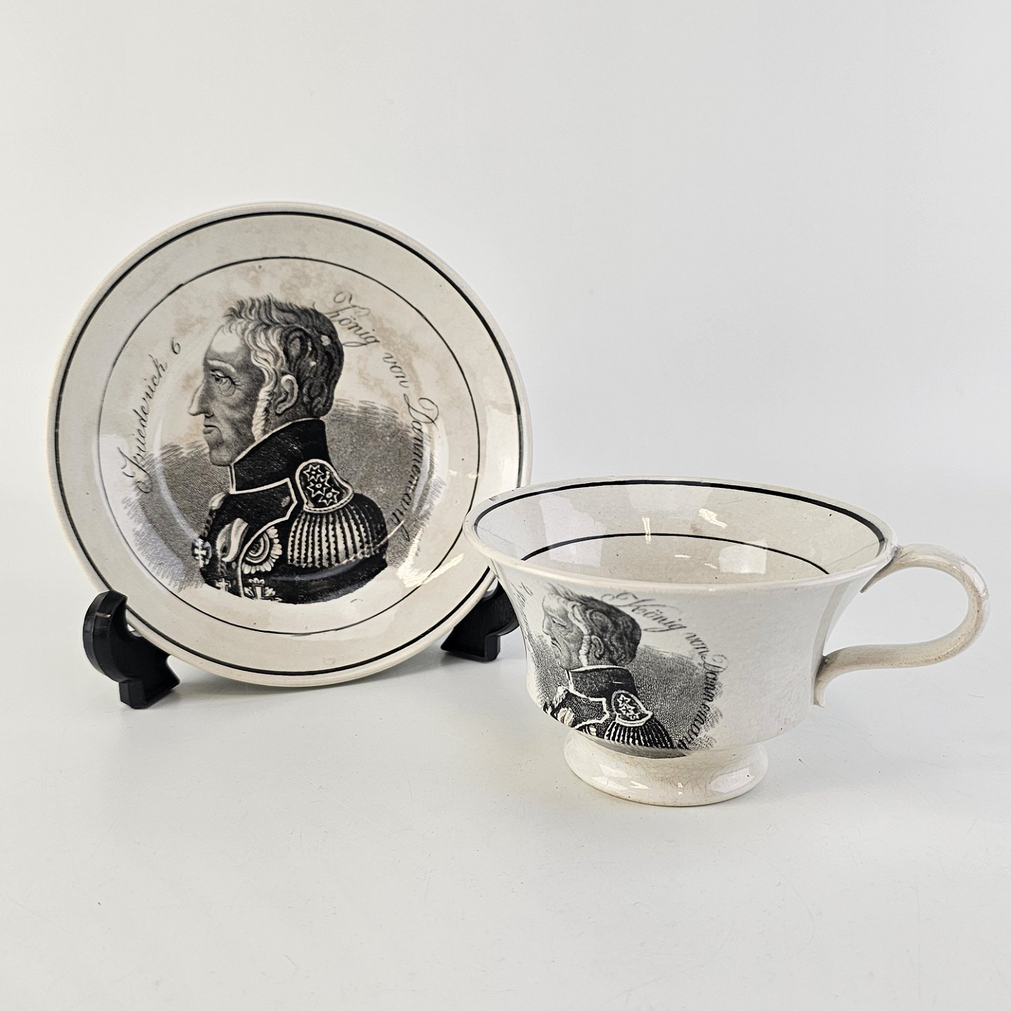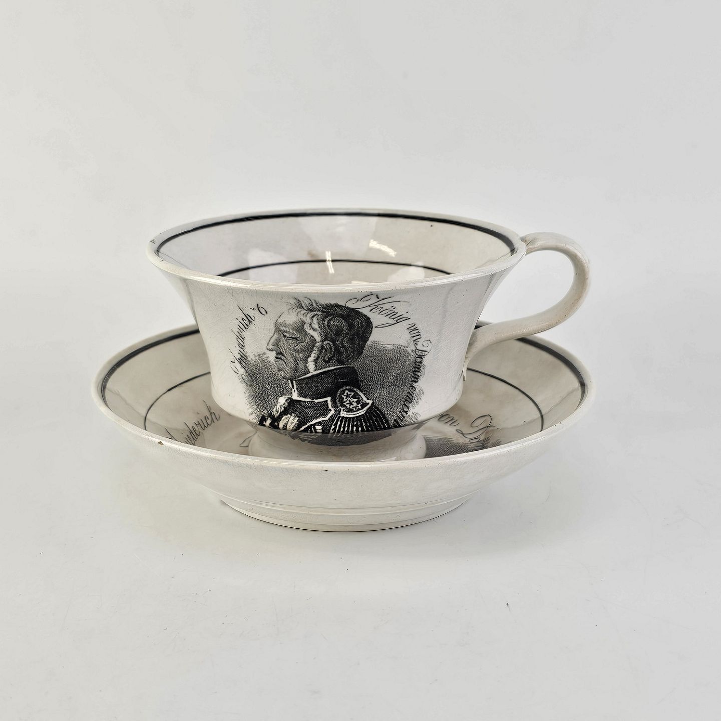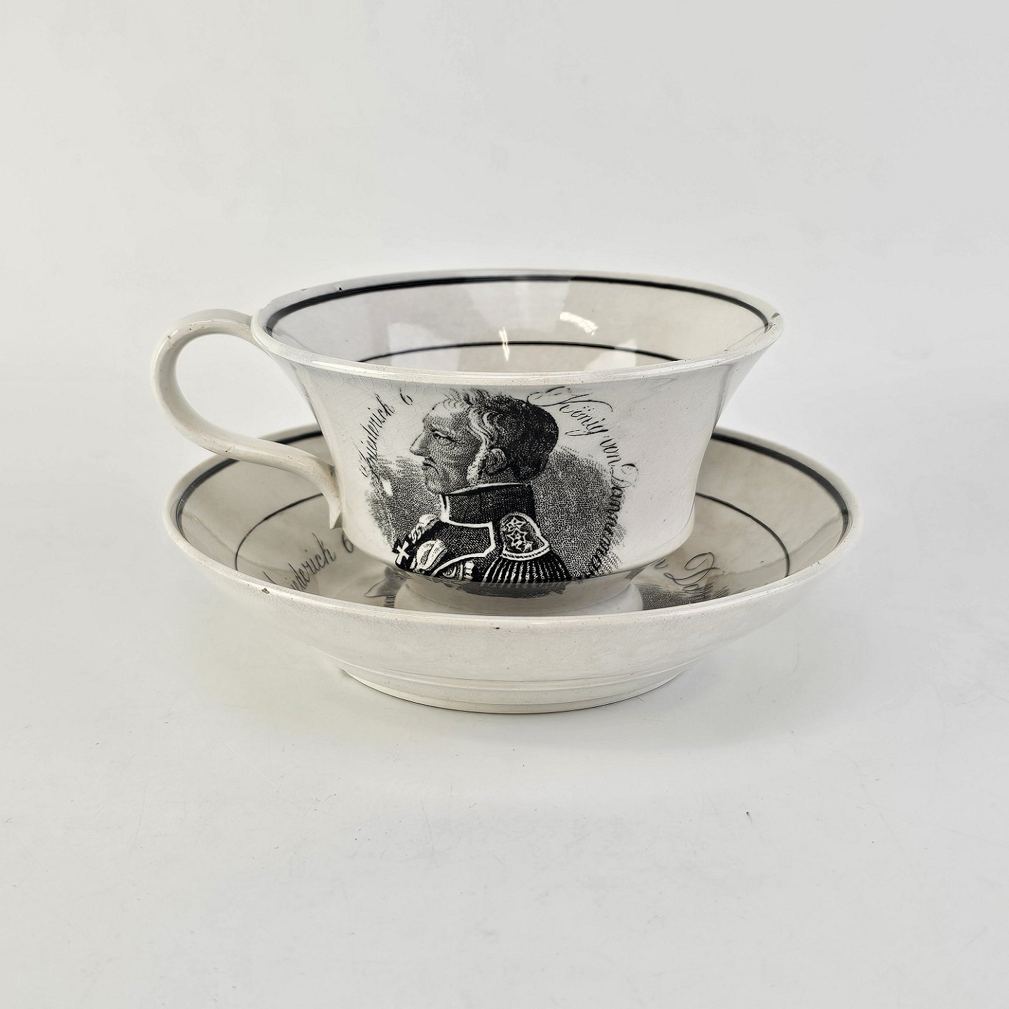 Kop og underkop af fajance med motiv af kong Frederik d. 6. af Danmark og tysk tekst. Formentlig tysk produceret til danske marked før der var en produktion i Danmark