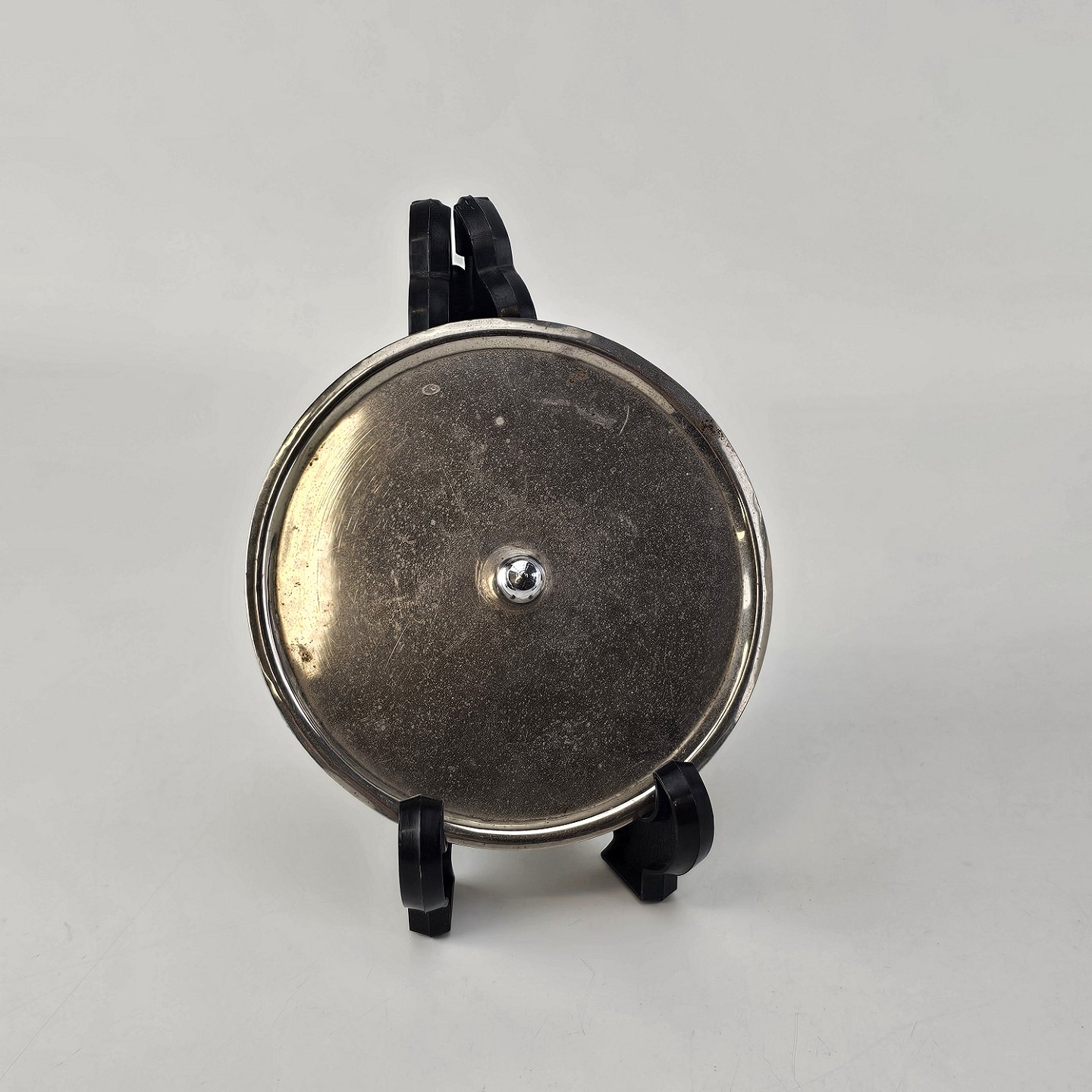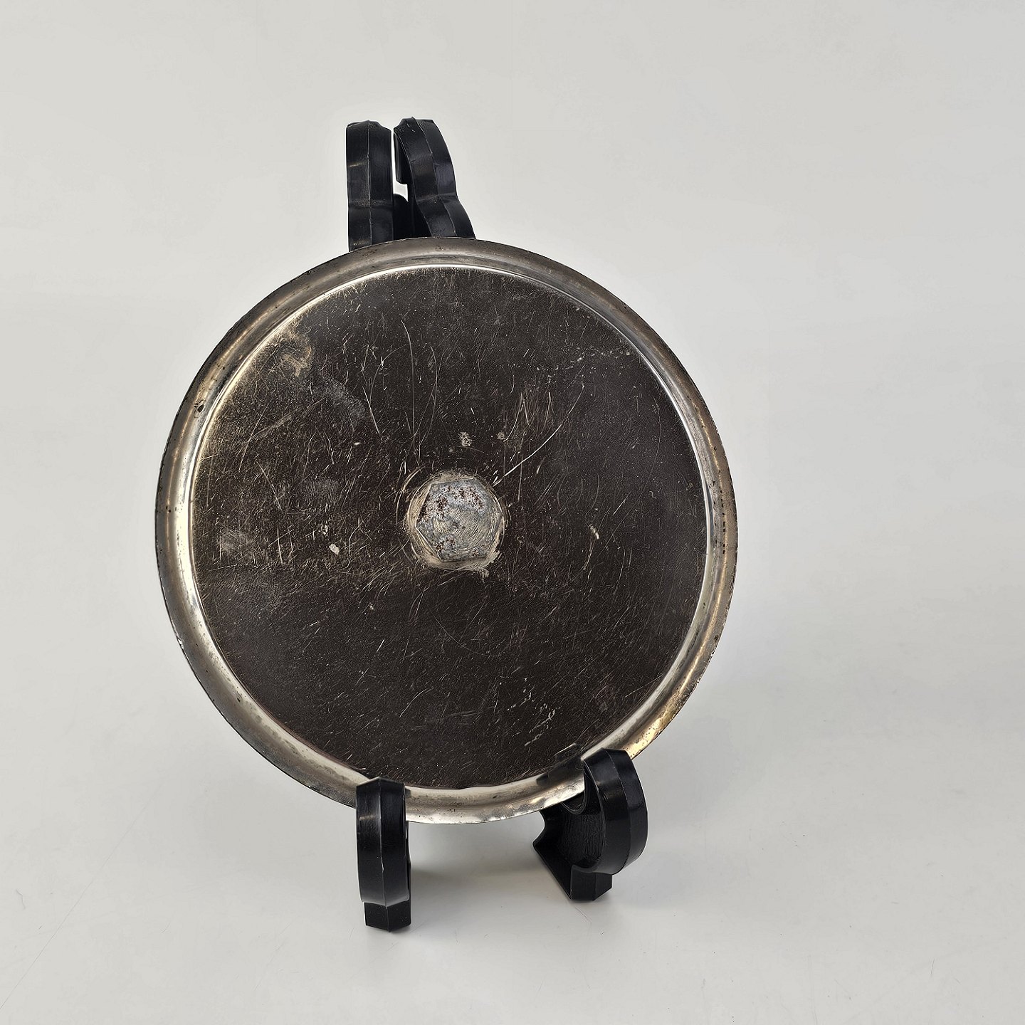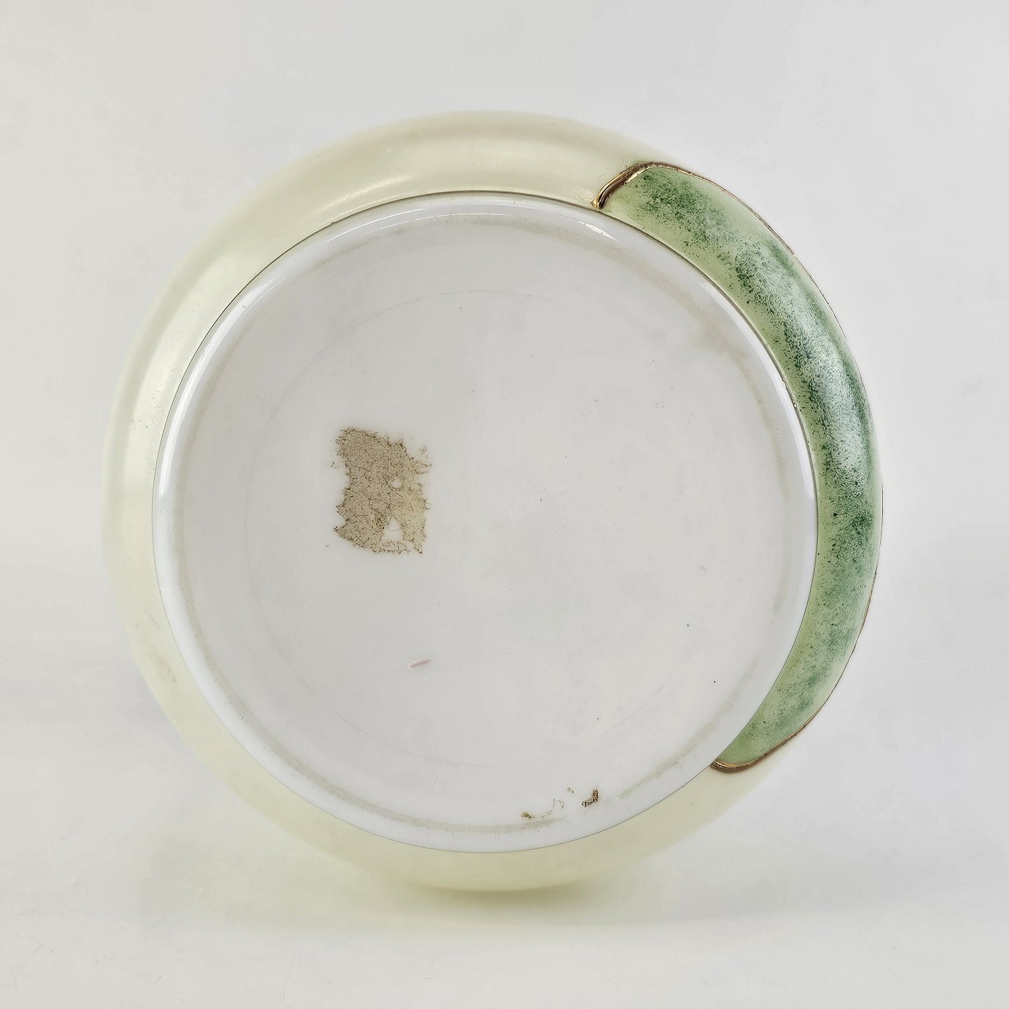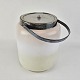 Håndmalet opalglas krukke med låg og håndtag, dekoreret med blomstermotiv. Låg og hank lavet af metal
