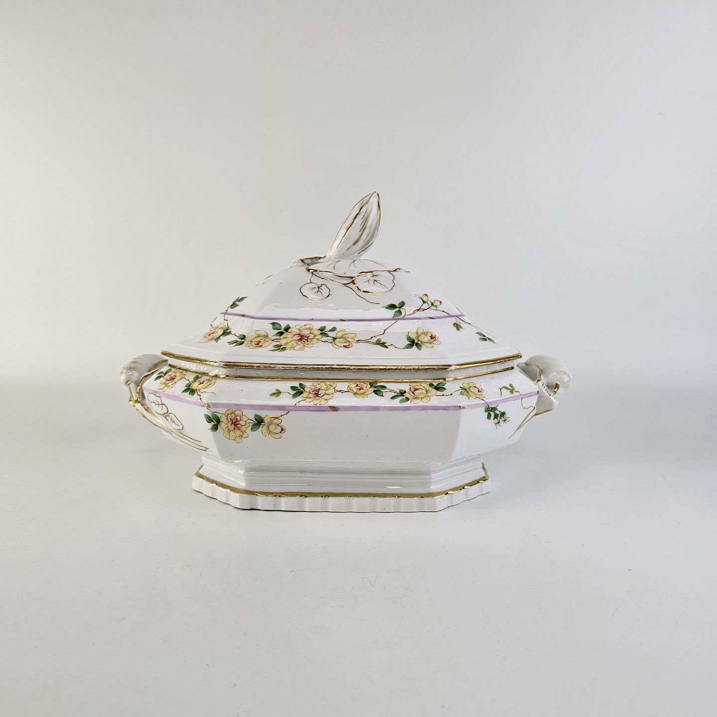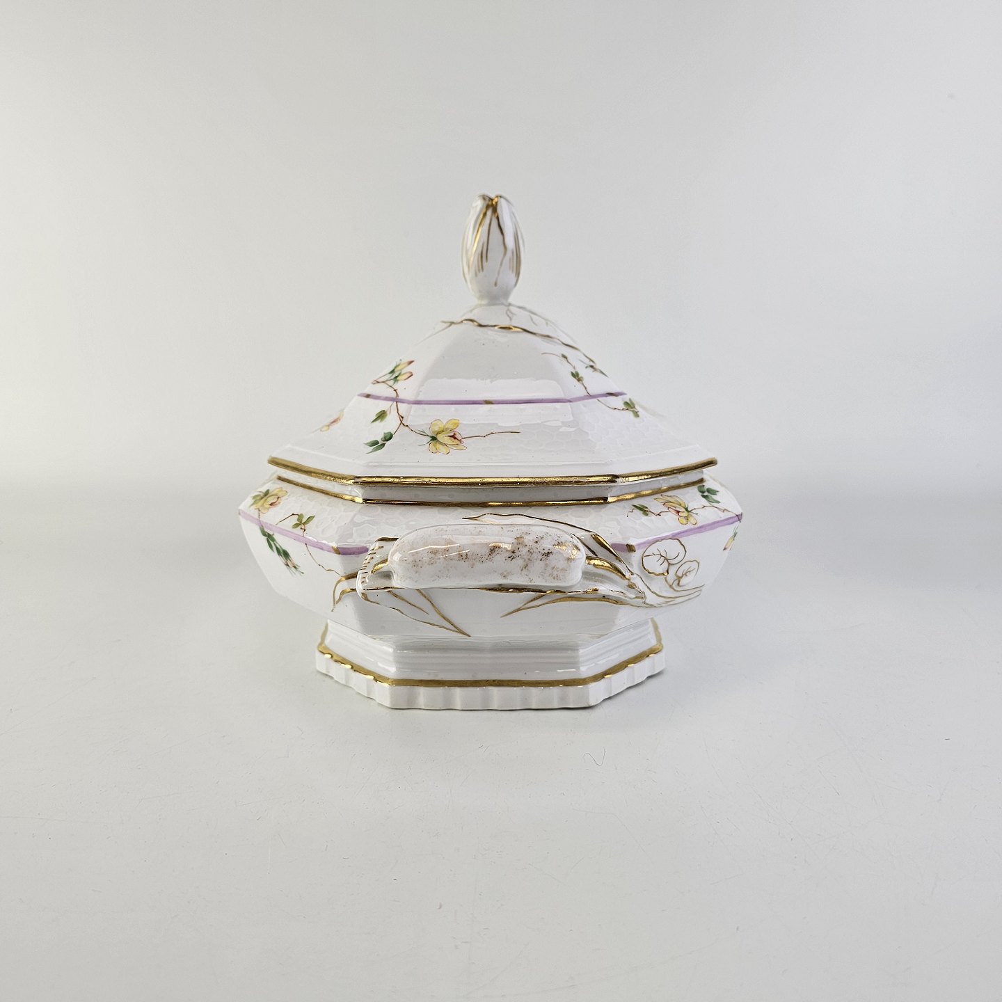 Service i hvidt porcelæn med hamret kantmønster dekoreret med gule blomsterranker og lyslilla streg. Stellet er med guldkant og det er mærket med bølger anvendt frem til 1890.