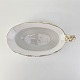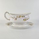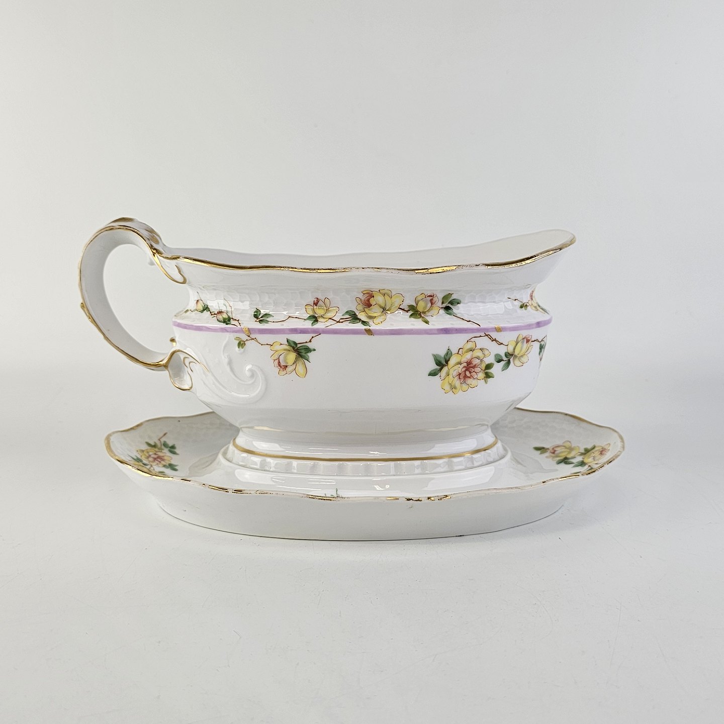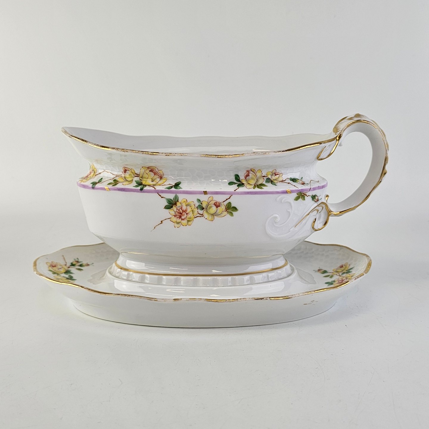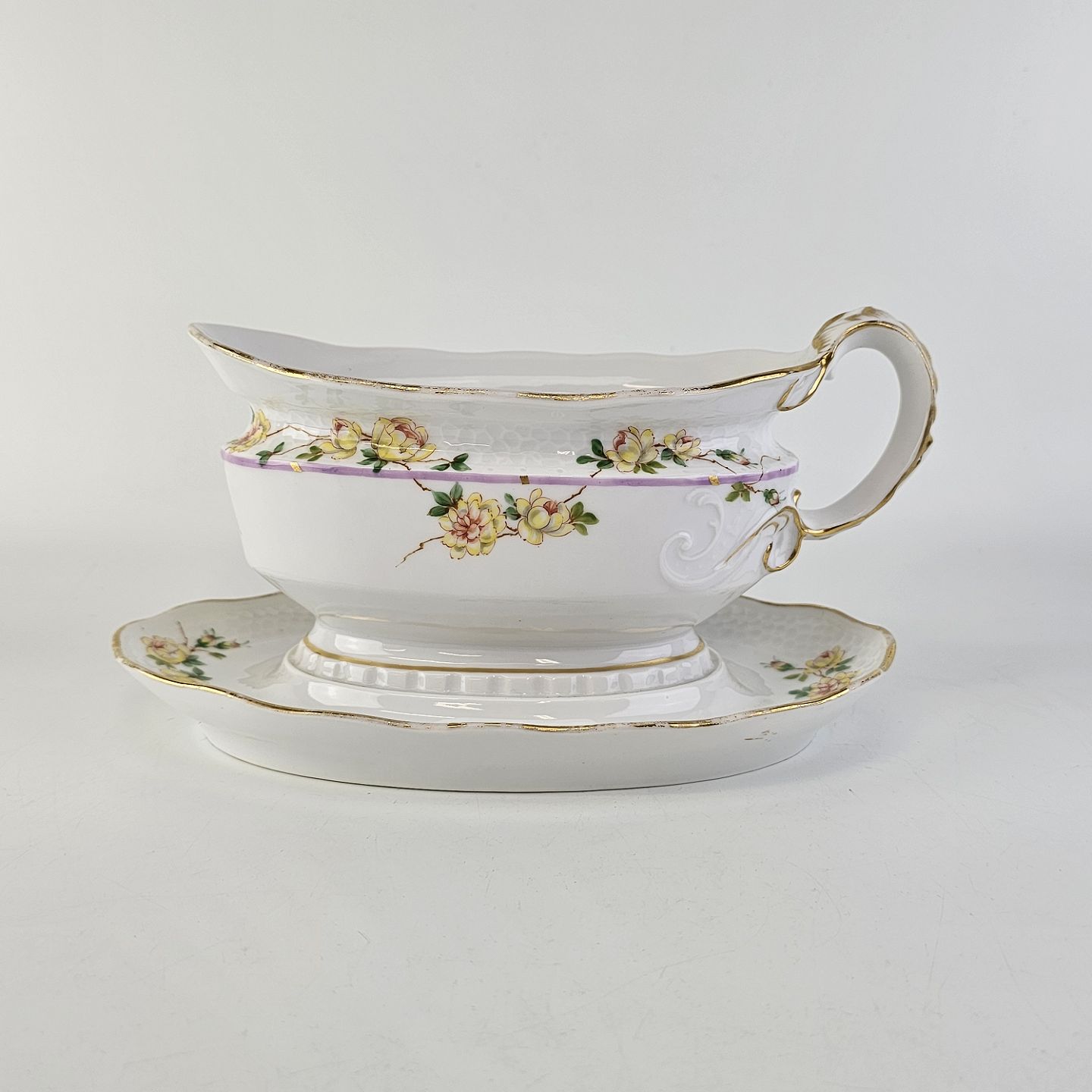 Service i hvidt porcelæn med hamret kantmønster dekoreret med gule blomsterranker og lyslilla streg. Stellet er med guldkant og det er mærket med bølger anvendt frem til 1890.