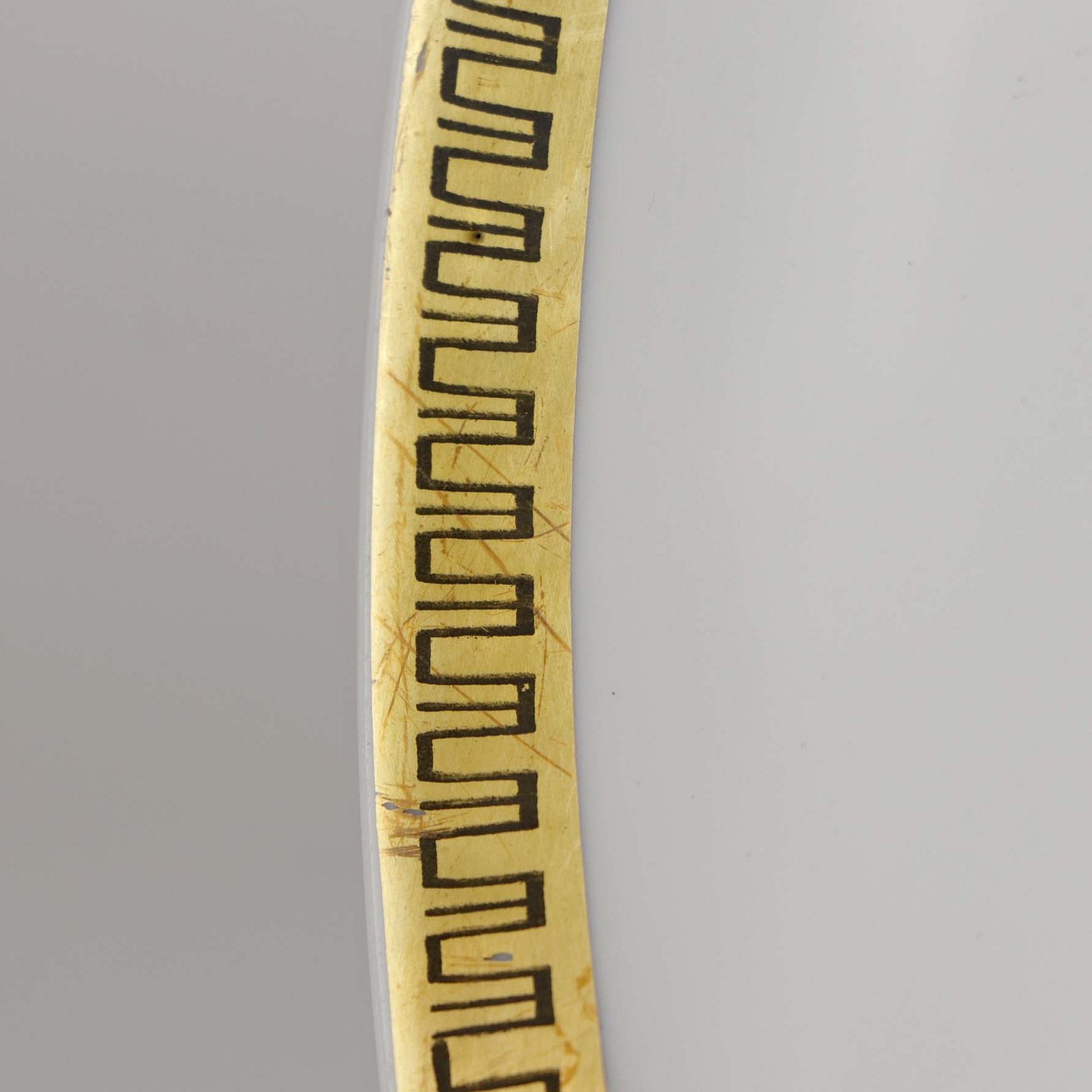 Stel i glat hvidt porcelæn dekoreret med sort streg i guldbort.