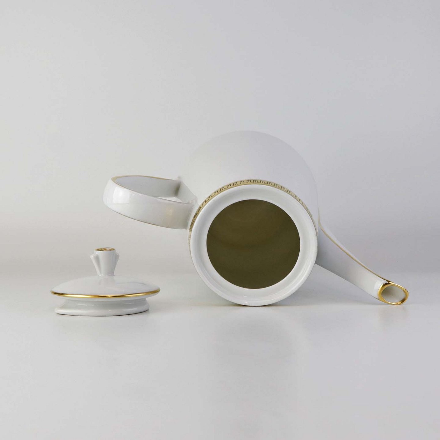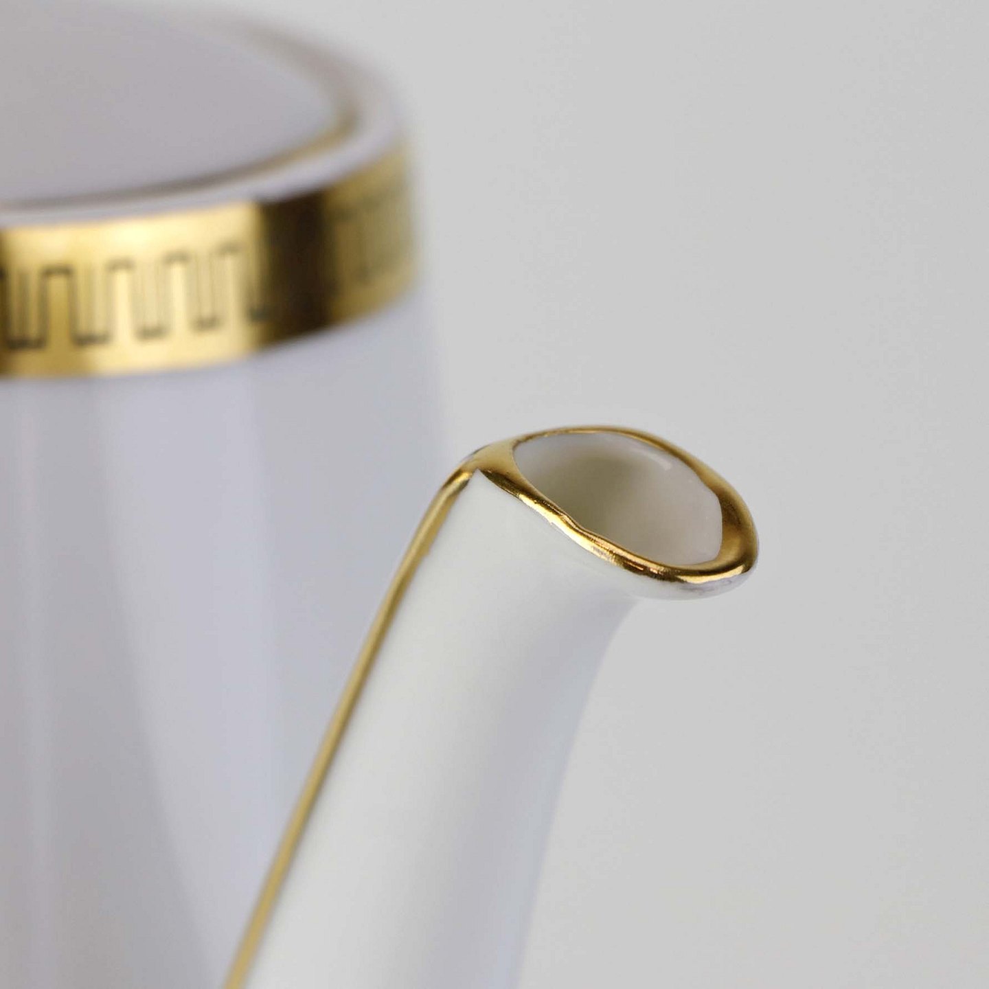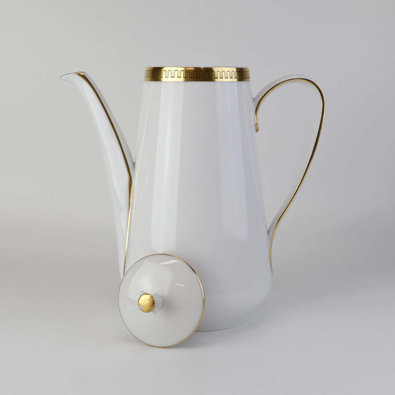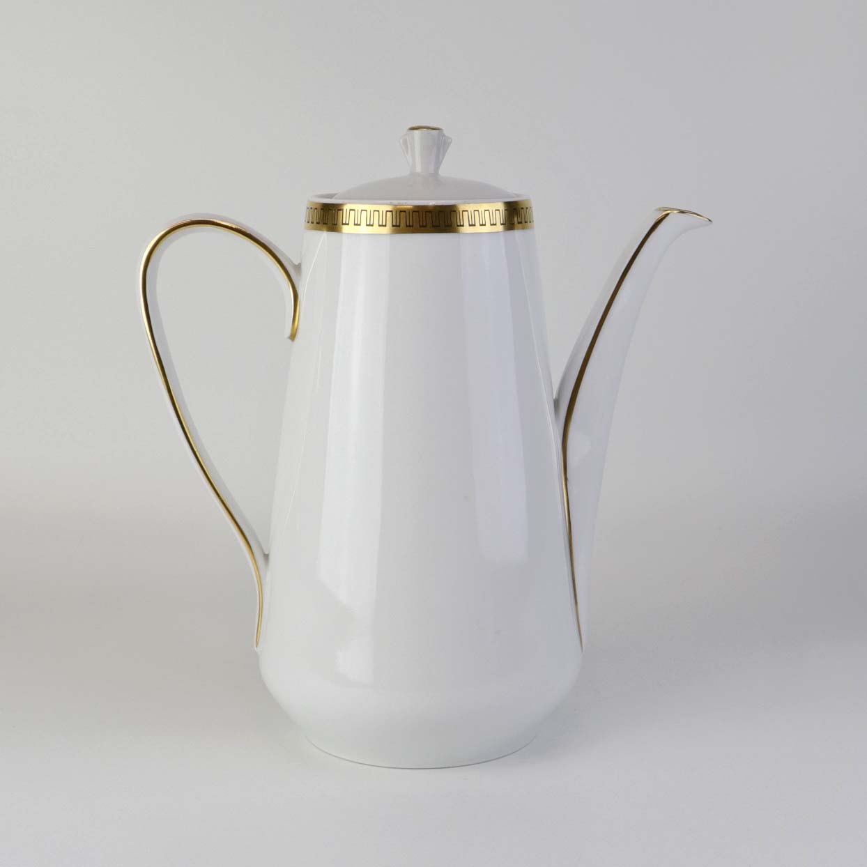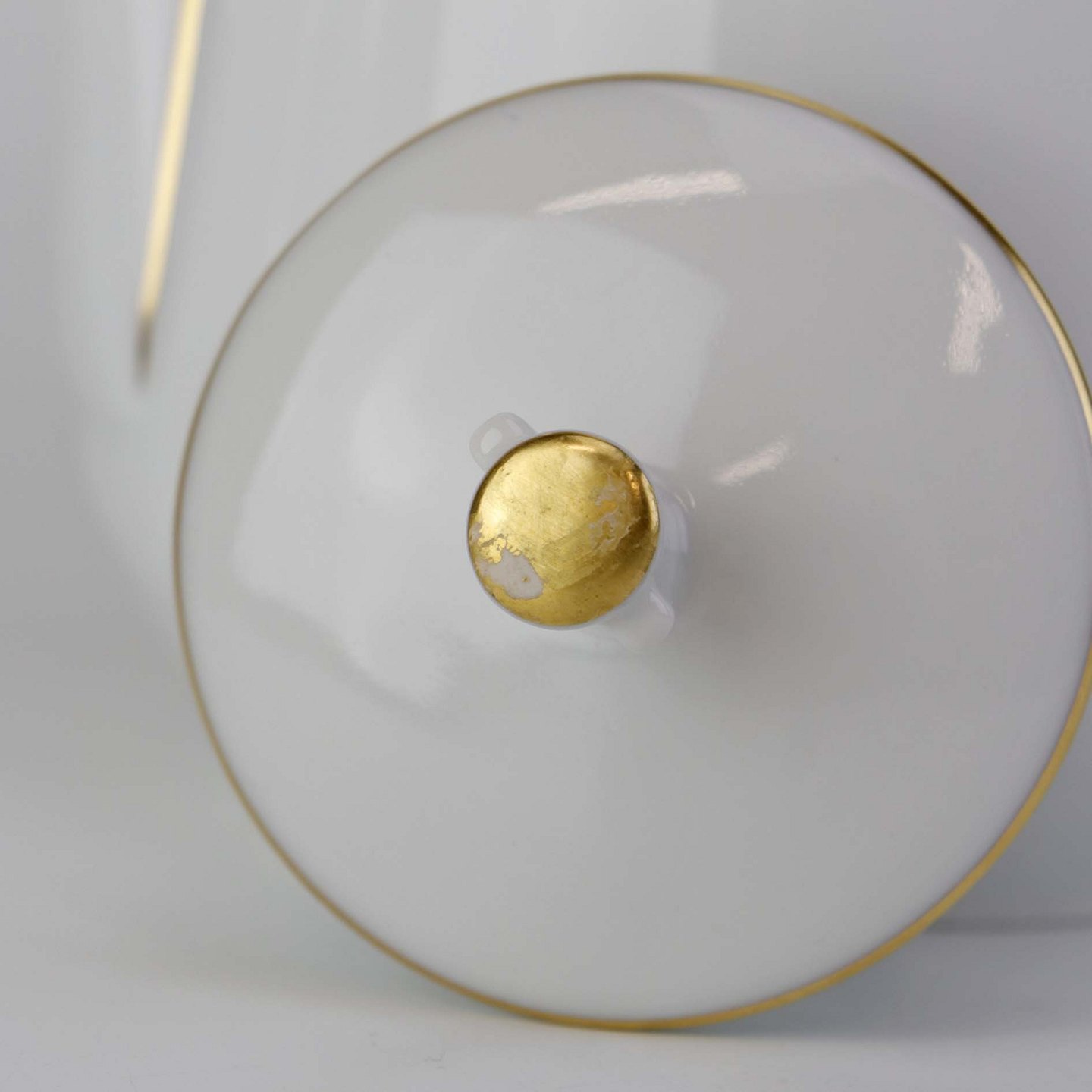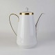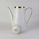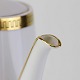 Stel i glat hvidt porcelæn dekoreret med sort streg i guldbort.