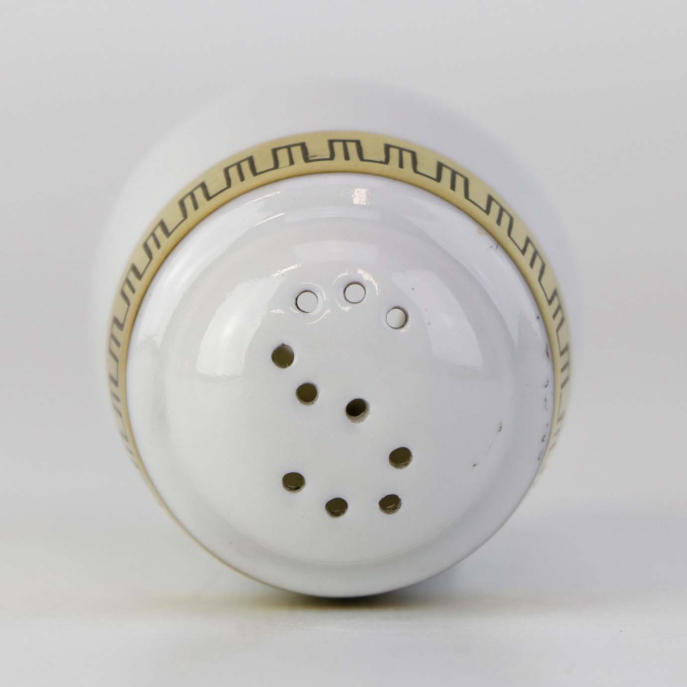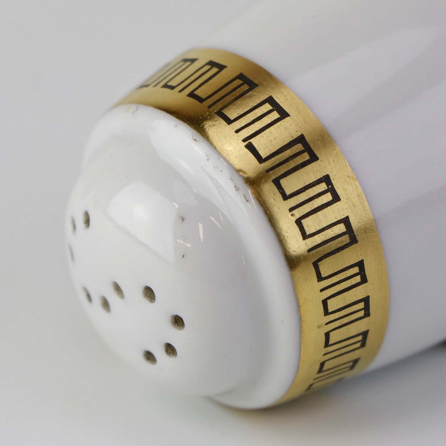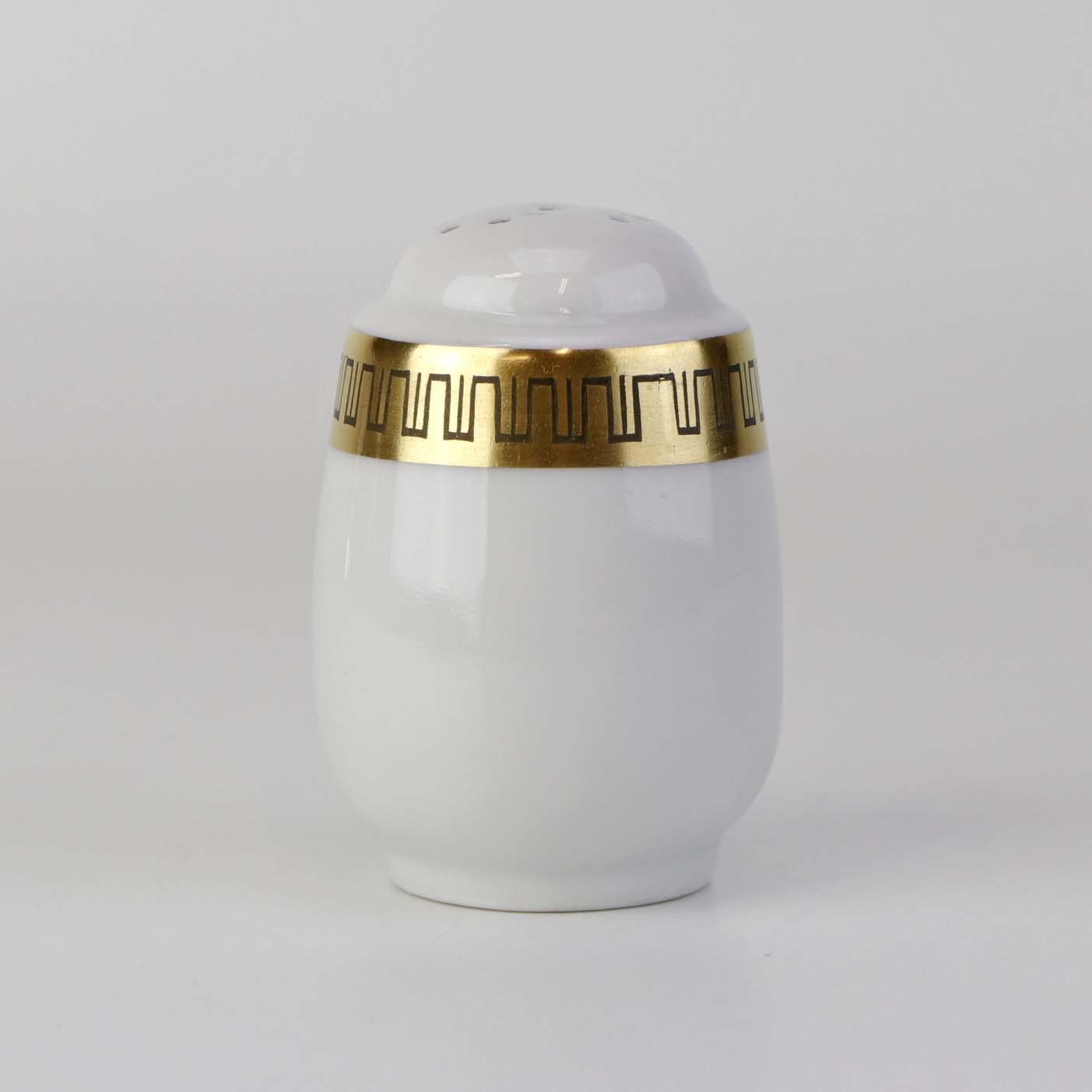 Stel i glat hvidt porcelæn dekoreret med sort streg i guldbort.