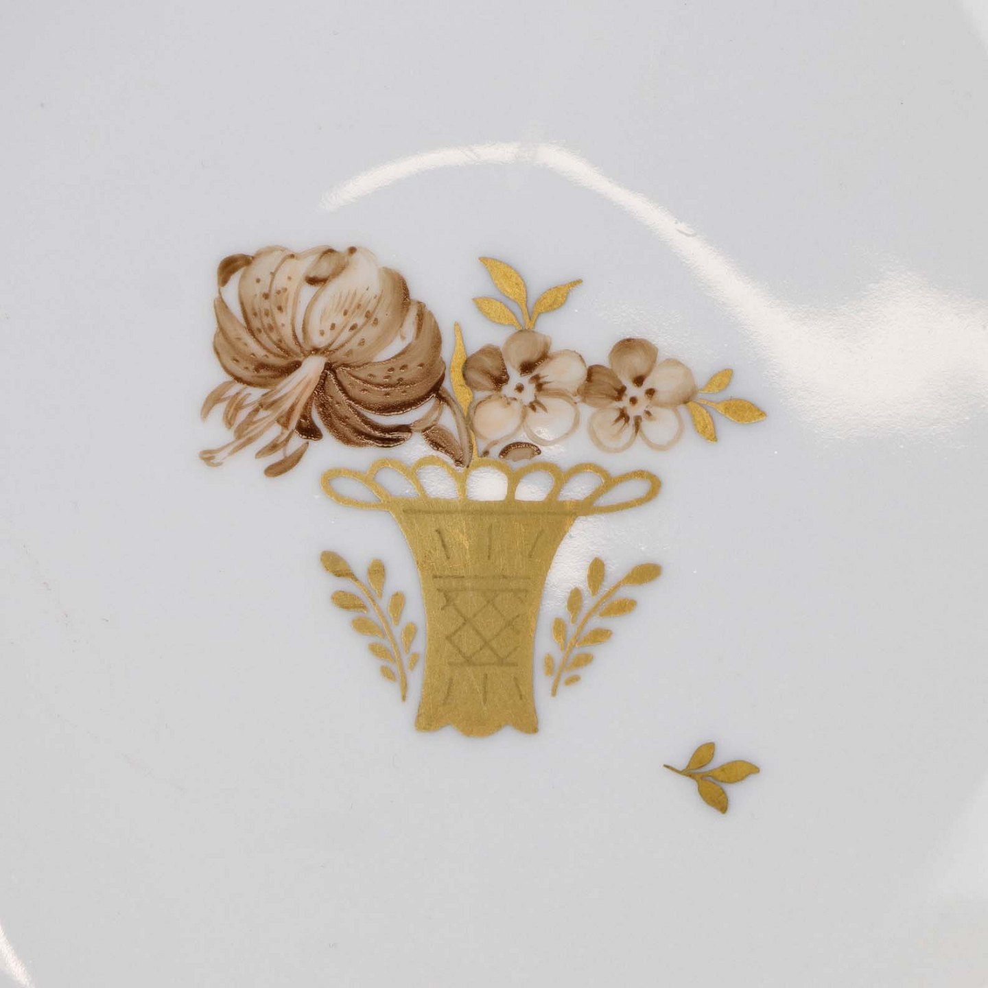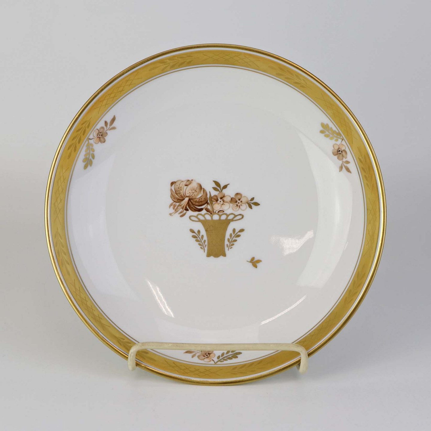 Stel i glat hvidt porcelæn dekoreret med guldkurv og brune blomster samt kantet af med guldbort med bladmotiv.