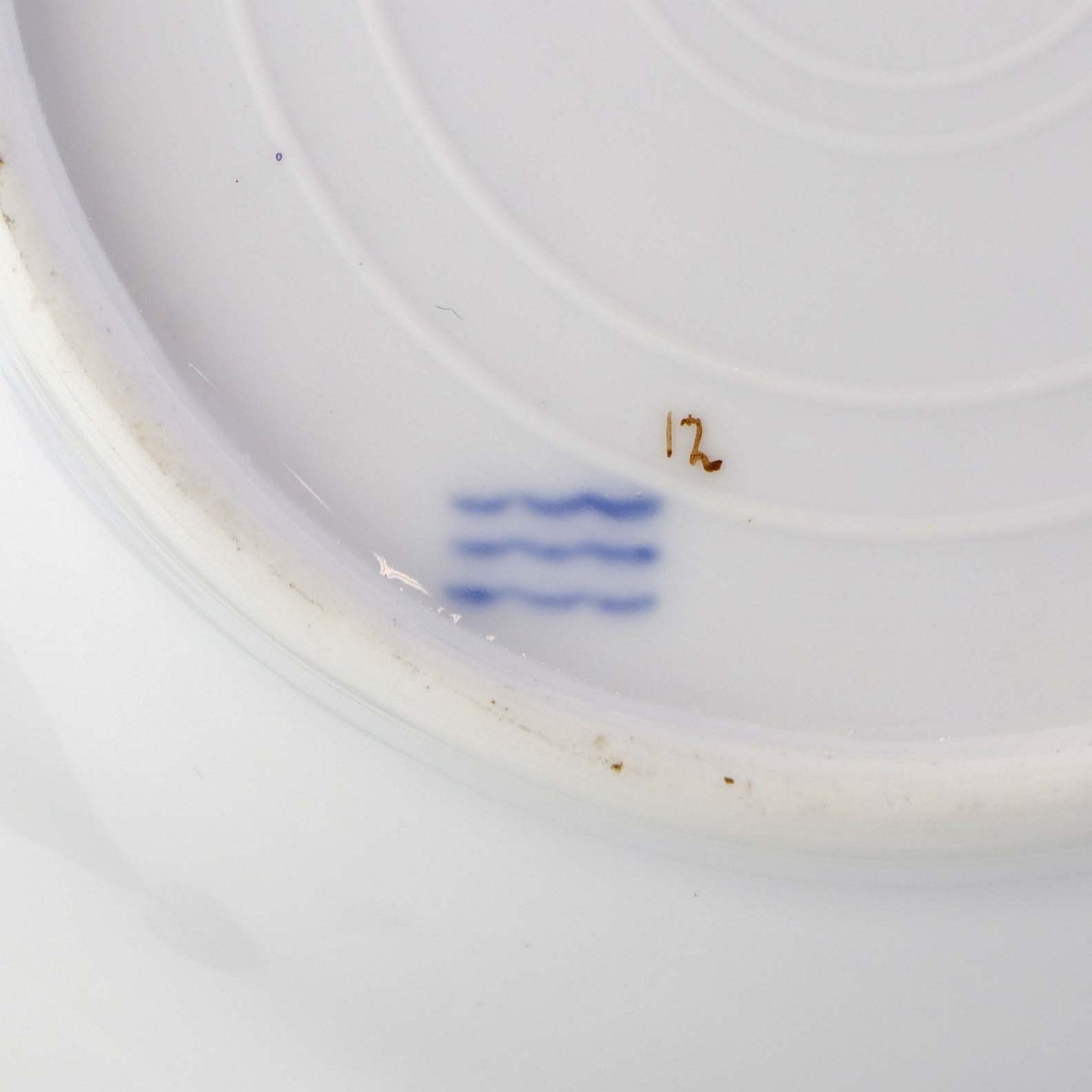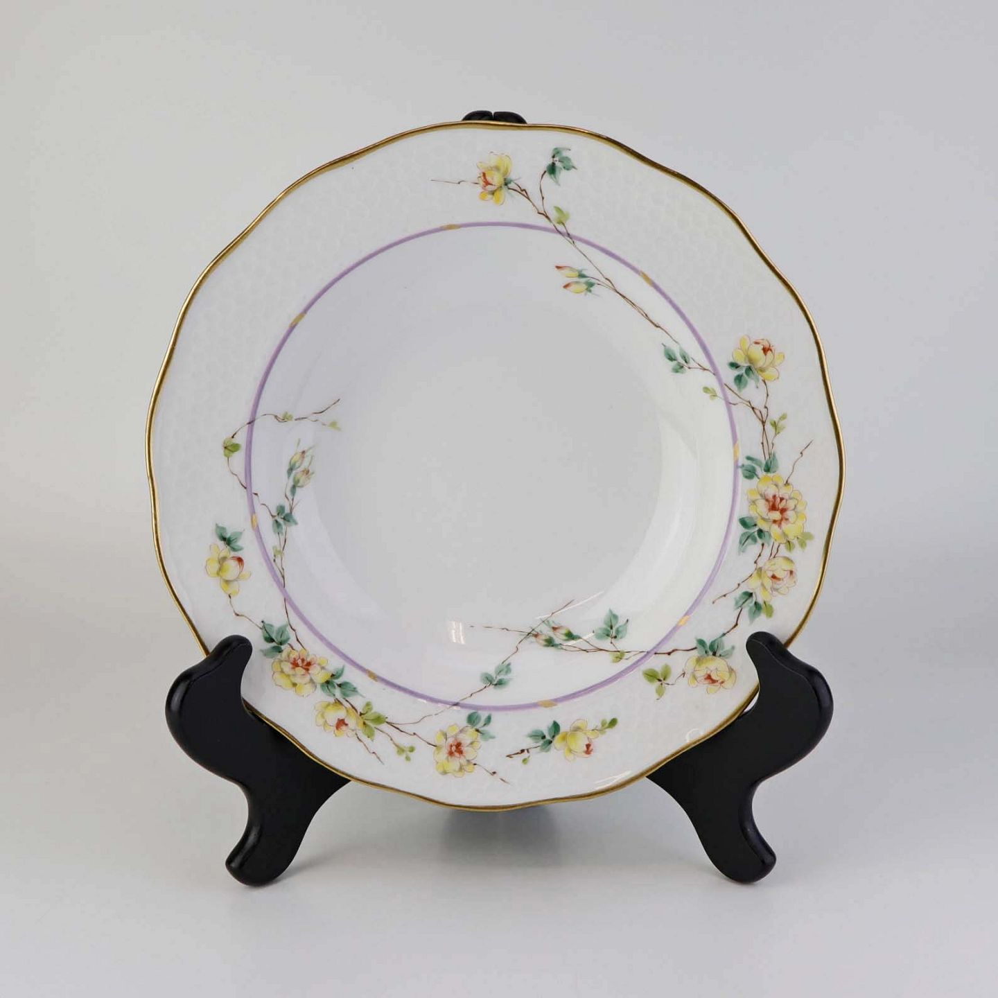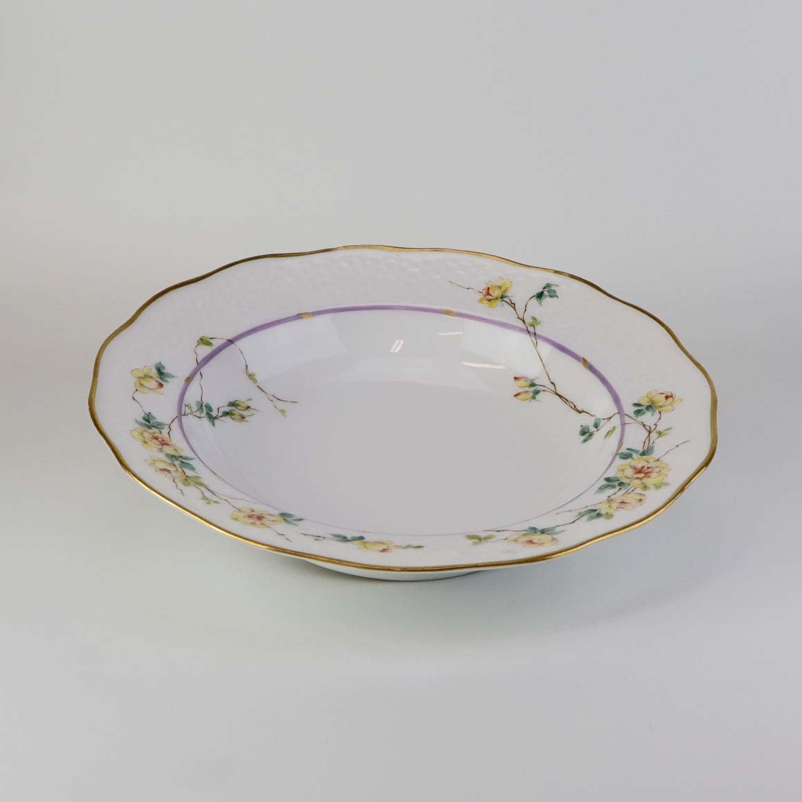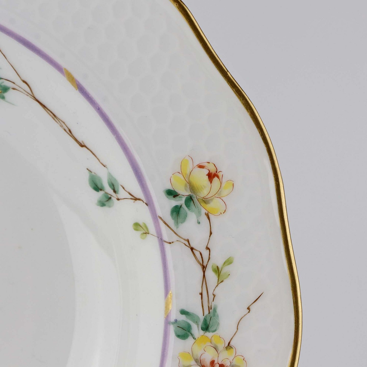 Service i hvidt porcelæn med hamret kantmønster dekoreret med gule blomsterranker og lyslilla streg. Stellet er med guldkant og det er mærket med bølger anvendt frem til 1890.